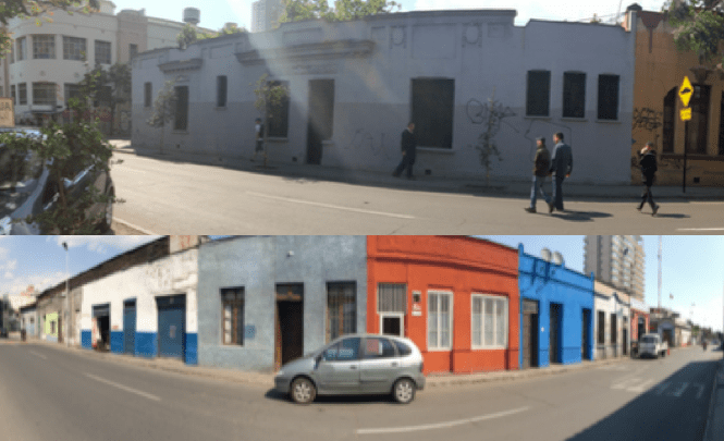 Primero definiremos la “Asociación Nacional de Mujeres Rurales e Indígenas”, la cual esta ubicada en calle Copiapó 1428, edificación de fachada continua, donde la cara Norte se encuentra expuesta hacia la calle Copiapó, destaca el rojo colonial de sus muros, los que se conforman de adobe estucado. Una de la principales características de esta fachada es la exposición a la radiación solar casi constante durante el día. Además esta conformada por elementos de la arquitectura tradicional, como la mampara en el acceso y el patio interior. Como parte de de ventilación encontramos grandes ventanas con marcos de madera, las cuales esta protegidas con barrotes de fierro de color blanco. El color y la materialidad, de la edificación son primordiales al momento de hacer el análisis de temperatura, porque son capaces de establecer diferencias notables al momento de realizar las mediciones.