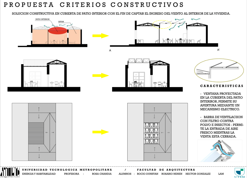 El patio interior es el centro de la casa y el principal captador de luz natural y ventilación, pero como se encuentra totalmente sellado produce un efecto invernadero en la vivienda. Para solucionarlo utilizaremos una solución constructiva en la cubierta de patio interior, con el fin de captar el ingreso del viento al interior de la vivienda. se utilizara una ventana proyectada en la cubierta del patio, que permite su apertura mediante un mecanismo electrónico, además tiene agregada una barra de ventilación con filtro contra polvo e incestos, que permite la entrada de aire fresco mientras la ventana se encuentre cerrada.