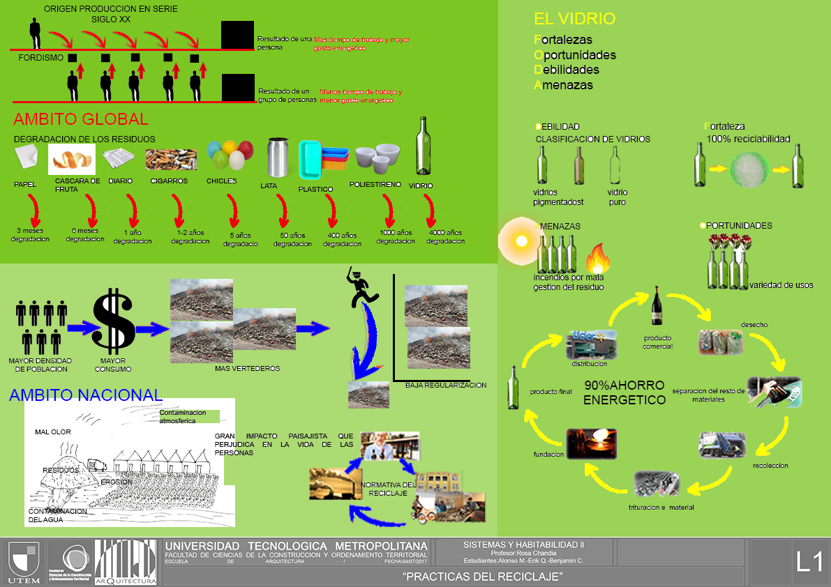 Gracias las actuales leyes y normativas que existen no tan solo en nuestro país sino que en el mundo podemos darnos cuenta de cómo el sentido de conciencia con el medioambiente ha progresado desde que se instauraron modelos económicos que no eran conscientes con el medio ambiente (fordismo) y lo único que se tomaba en cuenta era la producción en exceso y consumo de recursos para saciar necesidades más vinculadas a caprichos de la población. Luego con el paso de los años y los estudios realizados sobre las consecuencias que podía traer aquel modelo de producción gran parte del mundo comenzó a concientizar sobre el consumo en exceso y comenzaron a aparecer soluciones como el reciclaje, que se basa en el la reutilización de productos de primera mano con el fin de ahorrar recursos de producción inicial y ser empático con el entorno, de una forma que se logre un desarrollo sustentable, que se pueda progresar en el ámbito de lo económico, social y ecológico. En nuestro caso realizamos el análisis específico del vidrio como material fácil y efectivo de reciclar, viendo el progreso que algunos países han logrado como en España que a nivel europeo es pionero en reciclaje de vidrio, o también el caso de Colombia que como país lograron detectar muy temprano la problemática acumulación de residuos de vidrio que generaba y pudo crear una solución efectiva gracias al apoyo de empresas externas.