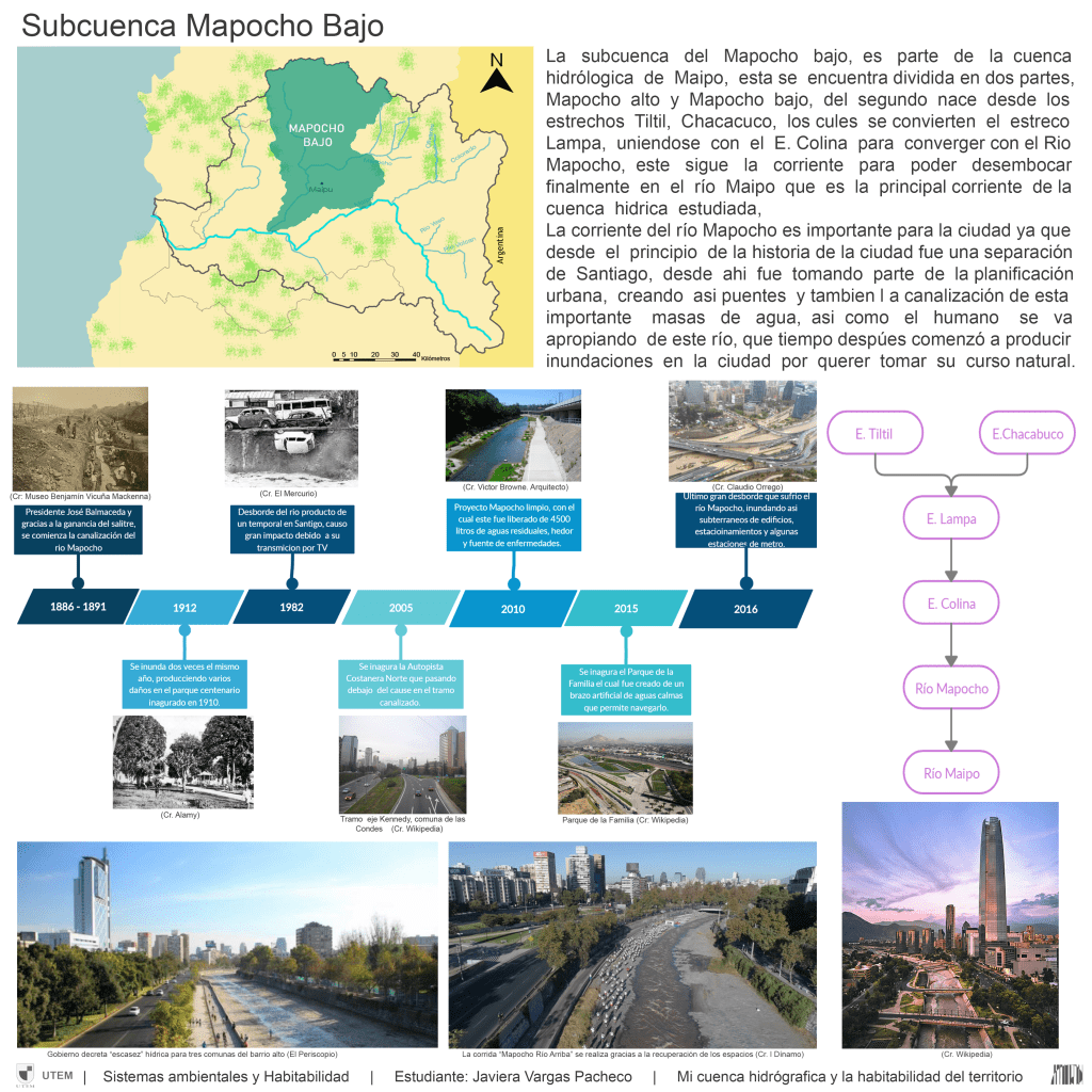 Después de esto nuestra escala cambiará a la subcuenca del Mapocho bajo, en donde podremos encontrar la historia de esta cuenca en donde desde un principio estas se comienzan a intervenir canalizándolas, es así como la primera intervención del hombre aparece en este río, es por esto, que las inundaciones son frecuentes a lo largo de la historia, sin embargo, en los últimos años la cantidad flujo del río a disminuido notoriamente. Siendo la crisis hídrica la consecuencia más importante al interrumpir este ciclo, la cual se desarrollará en la presente reflexión.