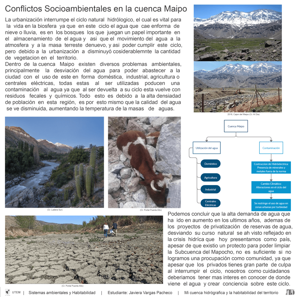El ciclo hidrológico es un proceso en donde la evaporación del agua de los océanos es llevada a la superficie terrestre a través de nieve y la lluvia que se filtrará hasta los subsuelos, retornando al océano a través de ríos y lagos, en este proceso los bosques son vitales, ya que estos controlan los flujos, reducen las inundaciones y sustentan el flujo en periodos secos, sin embargo, dentro de la urbanización de la ciudad estos ciclos han sido interrumpidos, ya que el agua es desviada de su curso natural, siendo así desviada para poder abastecer a la ciudad. En base a lo anteriormente expuesto presentaremos una reflexión del estudio de la cuenca hidrológica del río Maipo en una escala macro y como esta se ve vinculada con la Región Metropolitana con la utilización de sus aguas provenientes del caudal del río, dándoles un uso doméstico, industrial, agrario y centrales hidroeléctricas, la que es reincorporada después de su uso al efluente afectando la calidad de esta dada la contaminación existente.