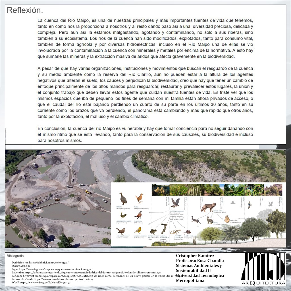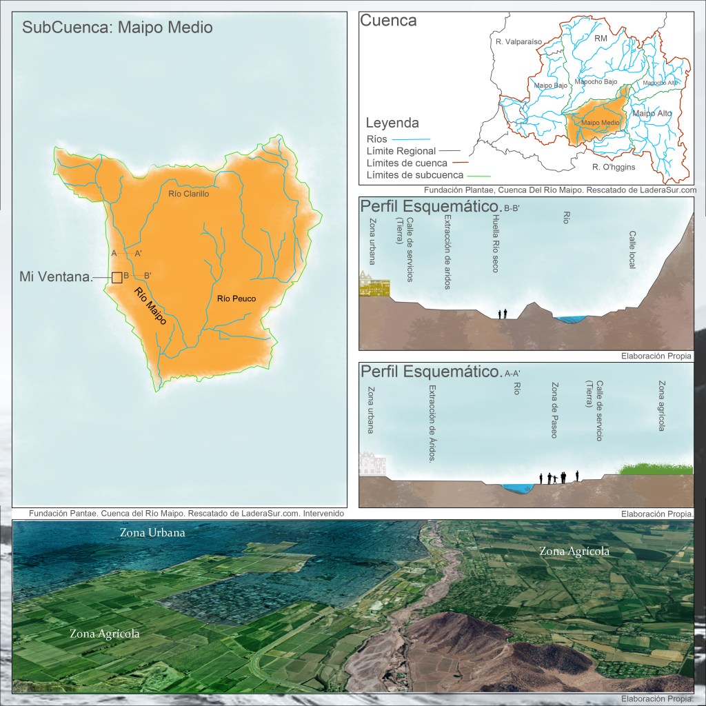 En este trabajo se hizo una mirada multiescalar, la cuál va desde una ventana de la comuna de San Bernardo a la Subcuenca del Río Maipo Medio hasta la cuenca completa. Entre esto, se analizan diversos puntos como el ciclo del agua, biología y diversos agentes que influyen en él. Además de generar un análisis del uso de suelo al rededor de la rivera del río, como explotación del mismo y generar una reflexión al respecto.