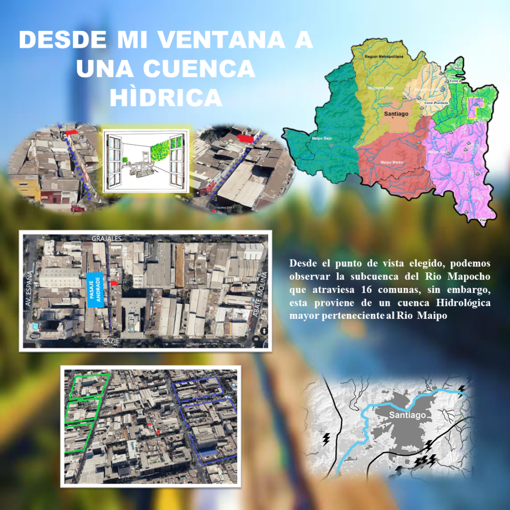 El trabajo «Desde mi ventana» tiene como propósito mostrar la observación de una cuenca hidrológica desde diferentes escalas, como lo podemos observar en la primera lámina que es el transcurso de visión desde mi domicilio hasta la subcuenca mas cercana que es el Río Mapocho Bajo y de ahí hasta su nacimiento en el Río Maipo.