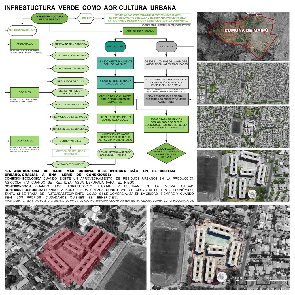 La infraestructura verde urbana es la estrategia de planificación de áreas verde, ya sean naturales o seminaturales, esto con el fin de entregar un amplio rango de servicios ecosistémicos, estas infraestructuras tienen funciones ambientales, sociales y económicas. Basándonos en esto, presentaremos la agricultura urbana relacionada a la infraestructura verde y como esta proporciona beneficios a la comunidad.