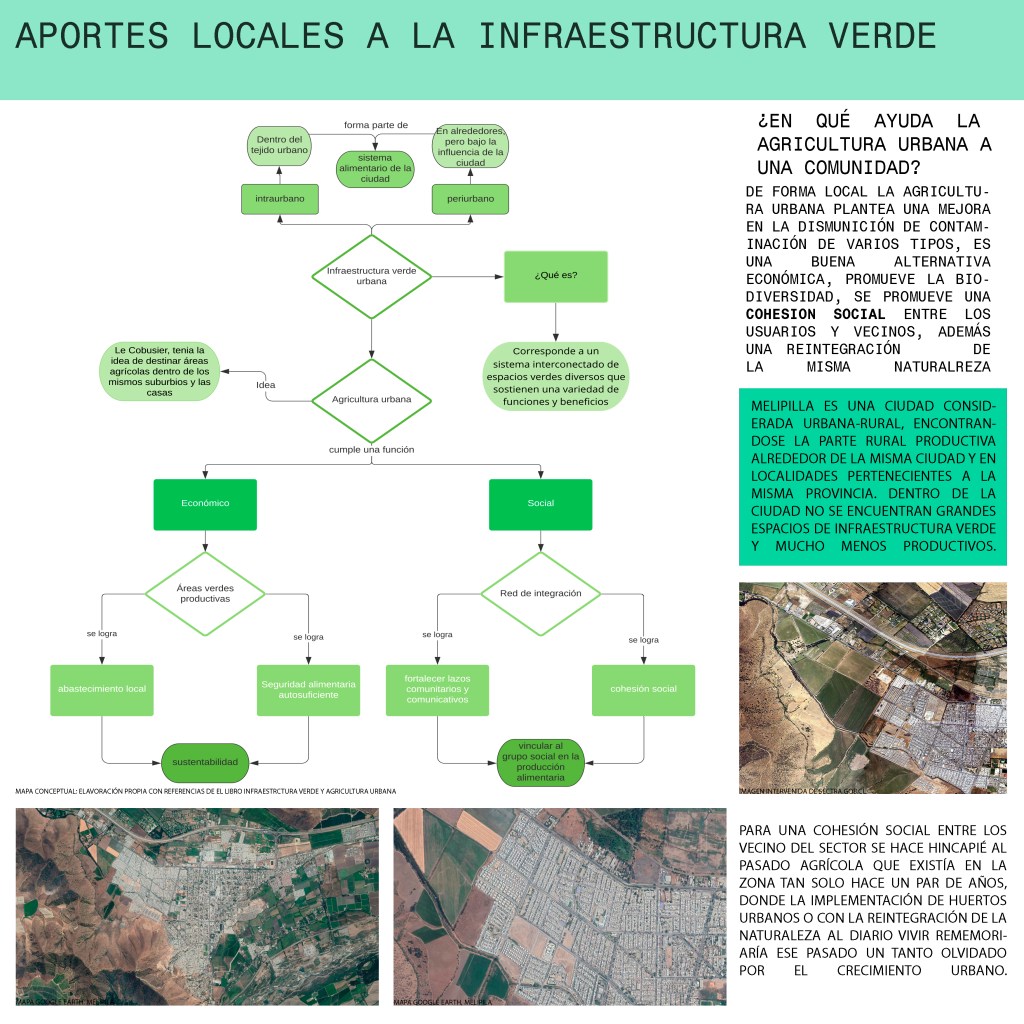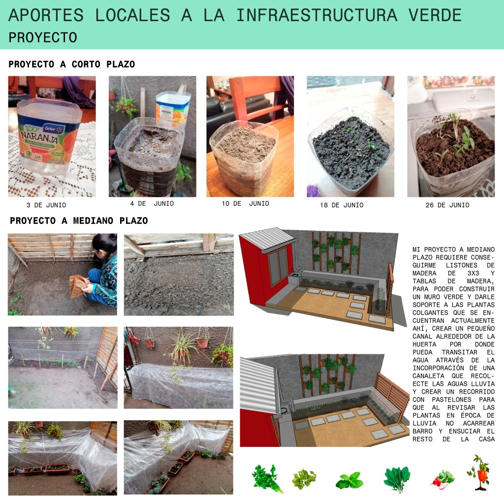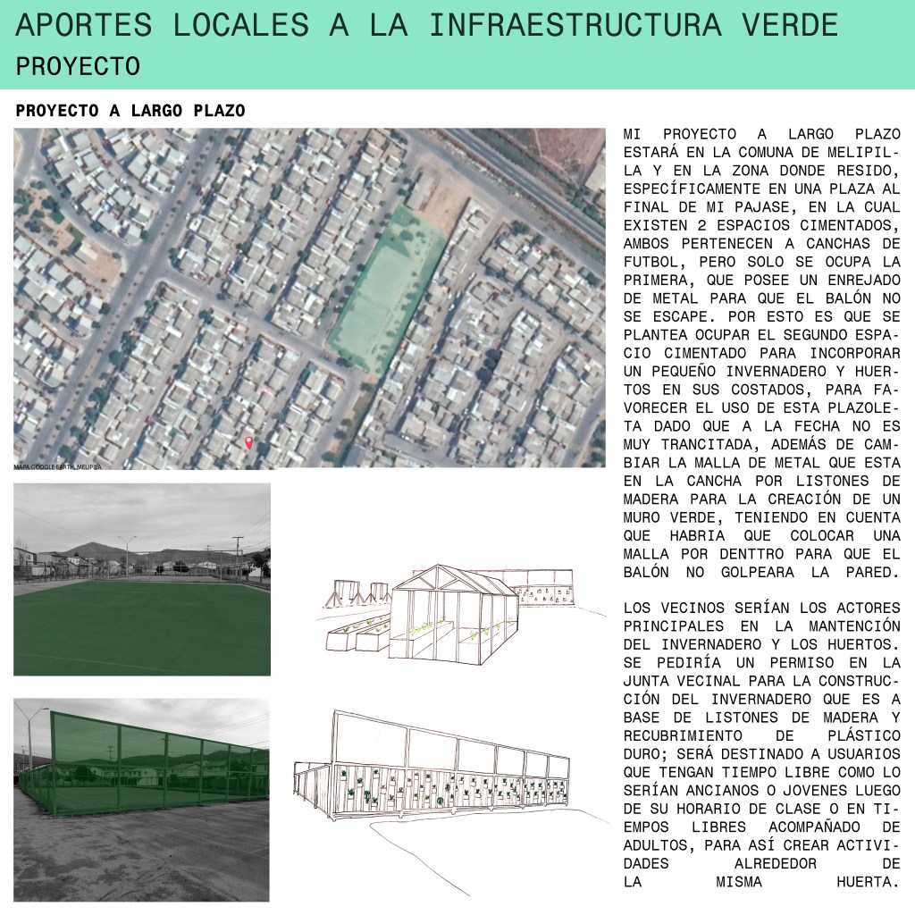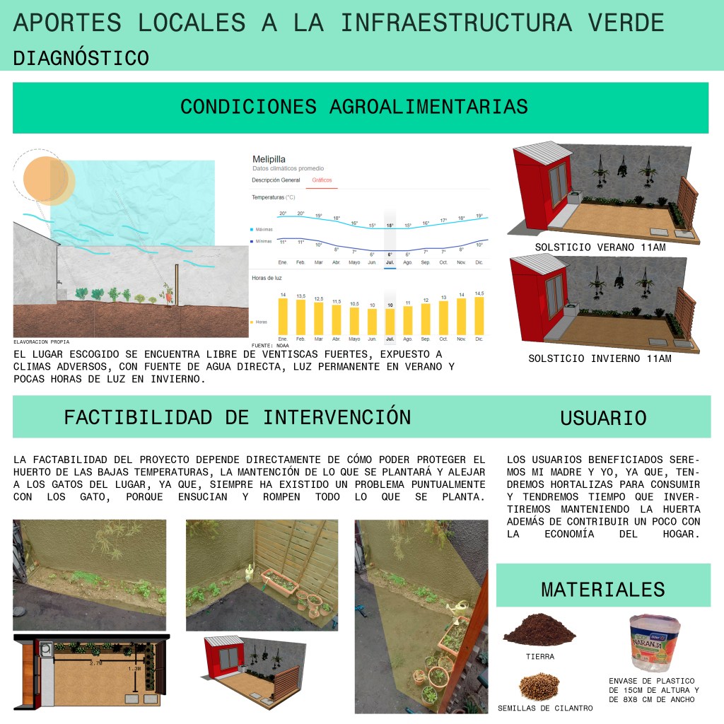 En el afán de ayudar a contrarrestar la poca equidad que existe entre lo construido a base de concreto y lo ligado a lo natural, nos situamos en la ciudad de Melipilla que es una ciudad Urbano-rural, pero al estar dentro de la ciudad uno se da cuenta que la parte rural no se ve para nada reflejada, ya que las áreas verdes existentes en la ciudad son tan sólo ornamentales. Muy alejado de lo que era antiguamente en algunos predios de la ciudad, donde efectivamente existían espacios destinados a la agricultura privada. Actualmente lo rural se encuentra en la periferia de la ciudad, en localidades más pequeñas en que su sustento está basado en la agricultura. Por esa razón había que intentar cambiar esto, empezando desde cosas pequeñas, como lo fue este inicio. Mi proyecto partió con la siembra de una planta de cilantro en un envase de plástico. Luego de ver que funcionaba se pasó a un proyecto a mediano plazo en que se tomaron más variables, como lo fueron las condiciones agroalimentarias, posibilidades de espacio y la factibilidad del proyecto. En realidad, no fue difícil llevarlo a cabo de un huerto en mi jardín, dado que ya existía un intento de ésta con anterioridad, aunque para nada planificado, y menos un análisis del lugar teniendo en cuenta las variables. Por esto es que se mejoró a tal punto en el que se pueden plantar alimentos que no son de estación, protegiéndolos de las inclemencias del clima. Se mejoró la pared directa donde se encontraba el huerto planificando mejor la vegetación que existía ahí, lo que dio un puntapié para la idea del proyecto a largo plazo, donde se implementa la misma premisa pero incorporando a los vecinos para crear una mejor unidad en el barrio.