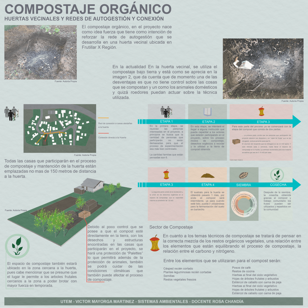 El proyecto presentado viene a ser la complementación de una propuesta ya ideada 1 y emplazada en Población Vermontt en la ciudad de Frutillar X Región, en esta parte se pretende adentrar en el proceso de re utilización que se puede llevar a cabo en huertas vecinales, la idea principal, es que todo esto sea parte de un proceso en donde todos los participantes que se hagan actores de este proyecto puedan intercambiar tanto la materia prima que ayudará al proceso de siembra y cosecha como ésta misma, siendo el resultado de todo un ciclo ideado y calendarizado.