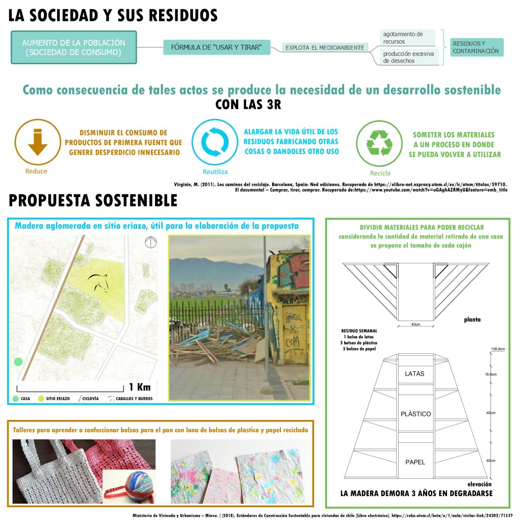 A partir del análisis de la comuna de Pedro Aguirre Cerda, aproximado a lo que resulta ser mi casa, se logra apreciar una gran problemática la cual es la cantidad de madera percibida en los sitios eriazos, que las personas aglomeran considerándolas residuos. En la búsqueda de reutilizar la madera se ha considerado útil para construir mini huertos, que en su diseño se le incrementa un espacio para dividir material (plástico, papel y latas) que en un futuro pueda ser reciclado, estos huertos se reparten por la comuna siendo los mismos vecinos parte del cuidado y funcionamiento.