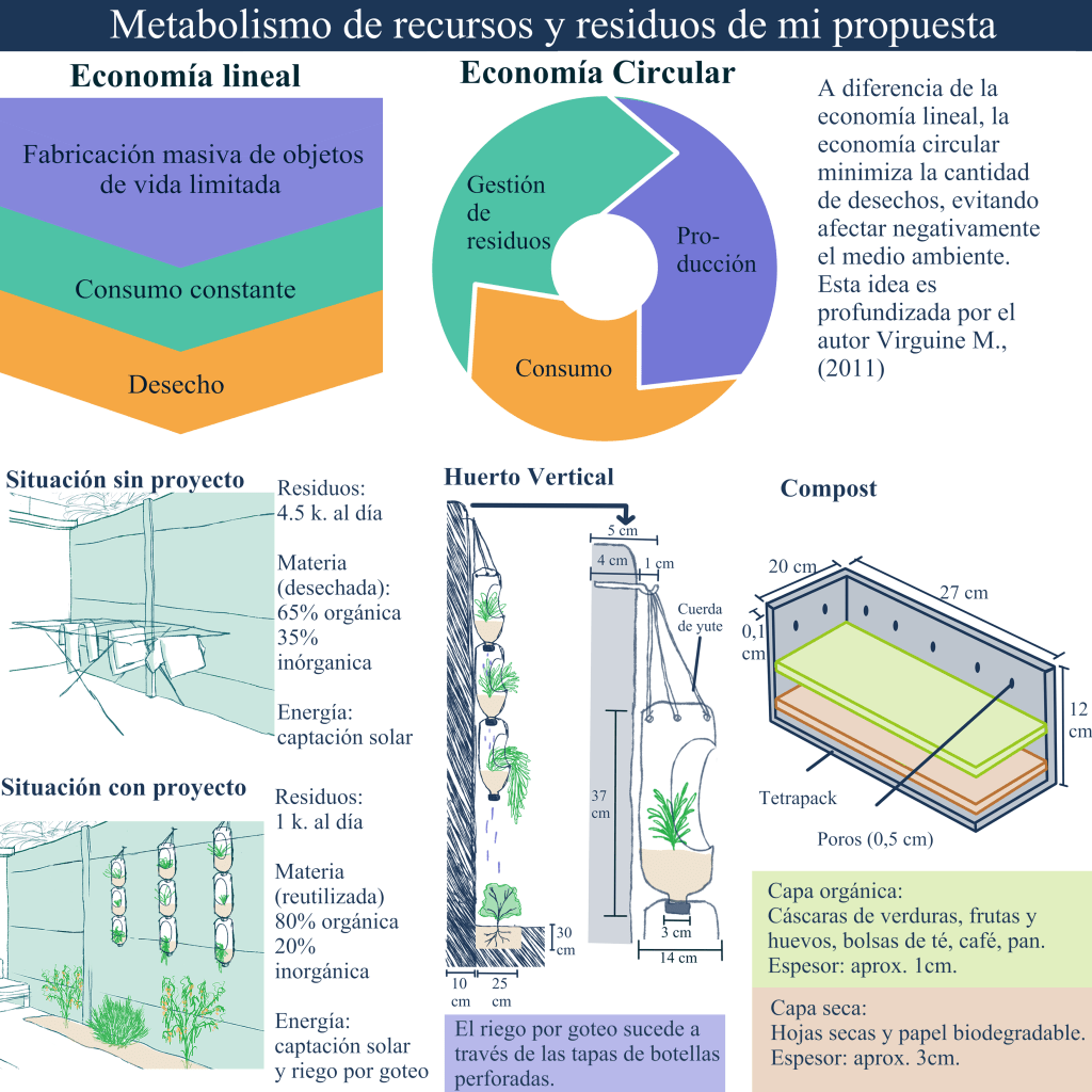 En cuarto lugar se optó por dos propuestas, siendo la primera la materialización de un compostero que estaría formado por cajas de tetrapack, el cual presente poros de 0,5 cm. a su alrededor. Dentro de este se ordenarían dos tipos de capas, siendo la primera una capa seca de aproximadamente unos 3 cm. de espesor que mezclaría tanto hojas secas como papel biodegradable, mientras que la segunda capa orgánica de aproximadamente 1 cm. estaría compuesta por cáscaras de verduras, frutas y huevos, bolsas de té, café y pan. Si bien estas capas deben ir de forma intercalada dentro del contenedor de tetrapack la última capa debe ser de secos ya que así se evita la invasión de alguna plaga o moscas. El compost debería estar ubicado preferentemente en lugares con luz ya que así completa de mejor forma el proceso de degradación.