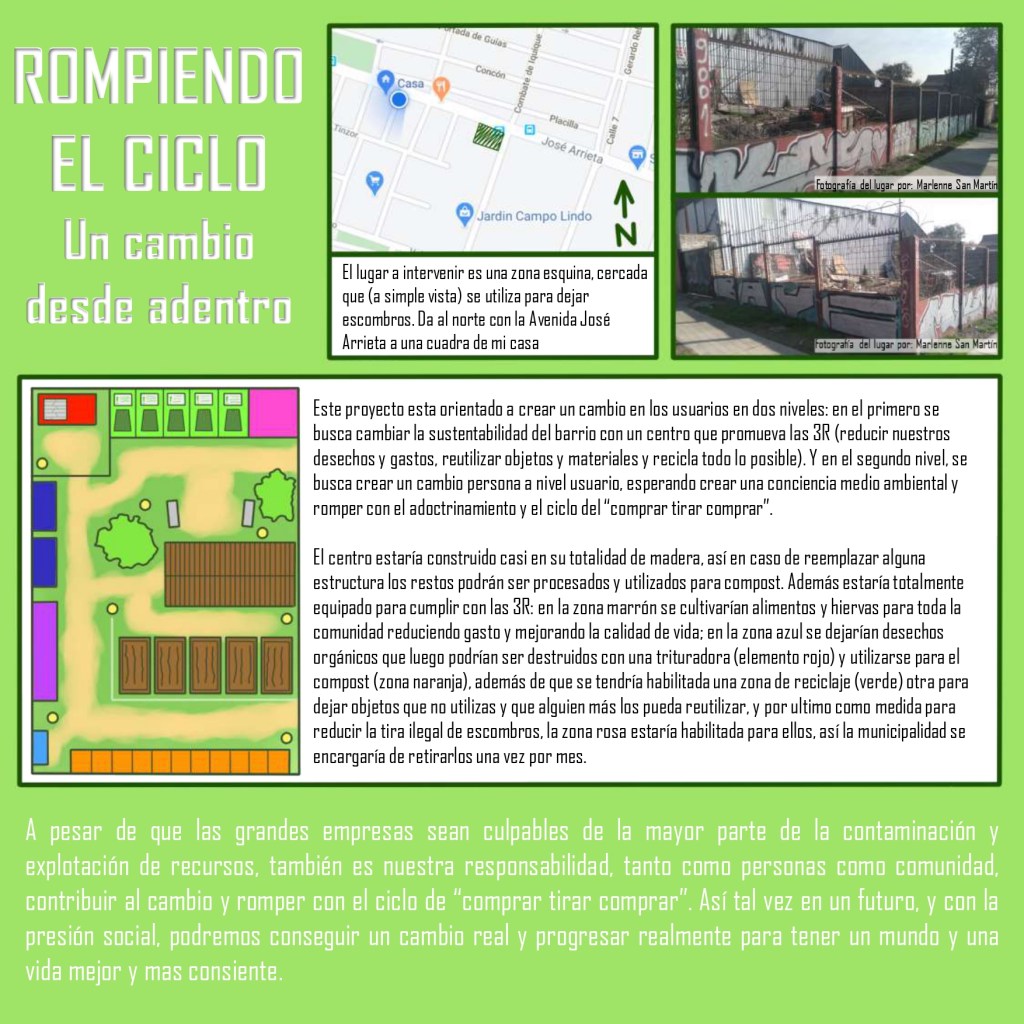 Aun así los cambios comienzan pequeños, por ello este proyecto está orientado a un grupo reducido de usuarios, a una pequeña parte del barrio, para generar conciencia en ellos y a la vez poder generar un cambio real en su producción de deshechos, un cambio desde adentro de un barrio, hasta el mundo entero.