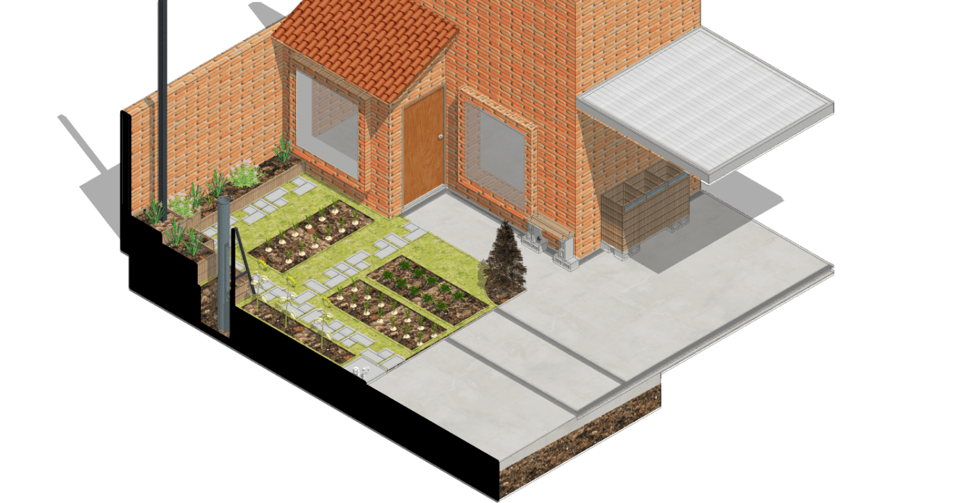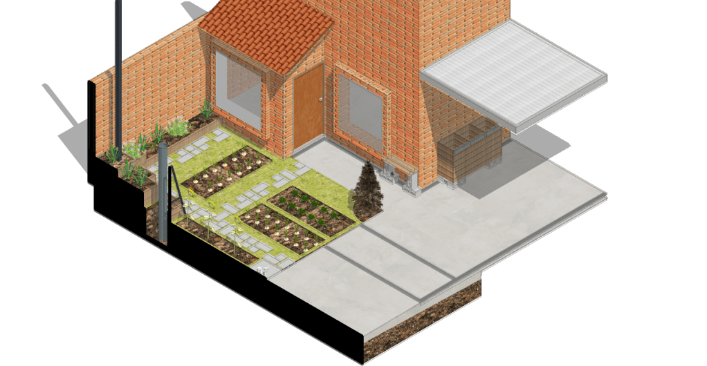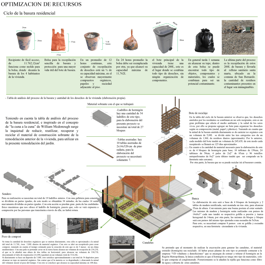 La presente lámina es una extensión de la publicación de agricultura urbana “Como poner orden al desorden: Contribución a la Biodiversidad“. Con una postura inclinada a la ecología se aborda el tema y se propone reducir, reutilizar, recuperar y reciclar material de remodelación de la vivienda analizada, con el objetivo de optimizar material y contribuir al mejor vivir de los residentes. Toda la basura emitida por los 4 habitantes estudiados, decanta en un bote de basura con dimensiones acotadas, cada vez que se llena la bolsa, esta se anuda y se transfiere al bote principal, pasado una semana se transfiere al relleno sanitario Santa Marta ubicado en la comuna de San Bernardo, donde convergen todo tipo de inimaginables residuos.
