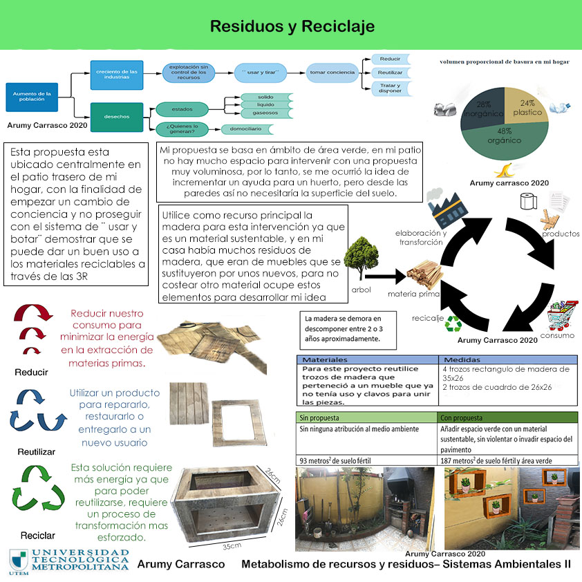 Mostrare una propuesta de re-utilización de la madera para crear y aportar una zona verde en mi hogar, en como al tener poco espacio no es un obstáculo para desarrollar un mejor cambio, que ayude un movimiento de agricultura urbana , que nos trae beneficios económicos , naturales y aportes a tener una alteración a tu espacio común, tener otro aire más limpio y sano , en como integramos la naturaleza y ver como crece vida en ella , estar en contacto diario con la tierra y así generar un cambio de conciencia en ver que aportando con estas acciones y transmitir a otras personas se puede generar un cambio mayor y que se puede traspasar a las siguientes generaciones para que no comentan los mismos errores que nosotros al no cuidar nuestros espacios y recursos naturales.