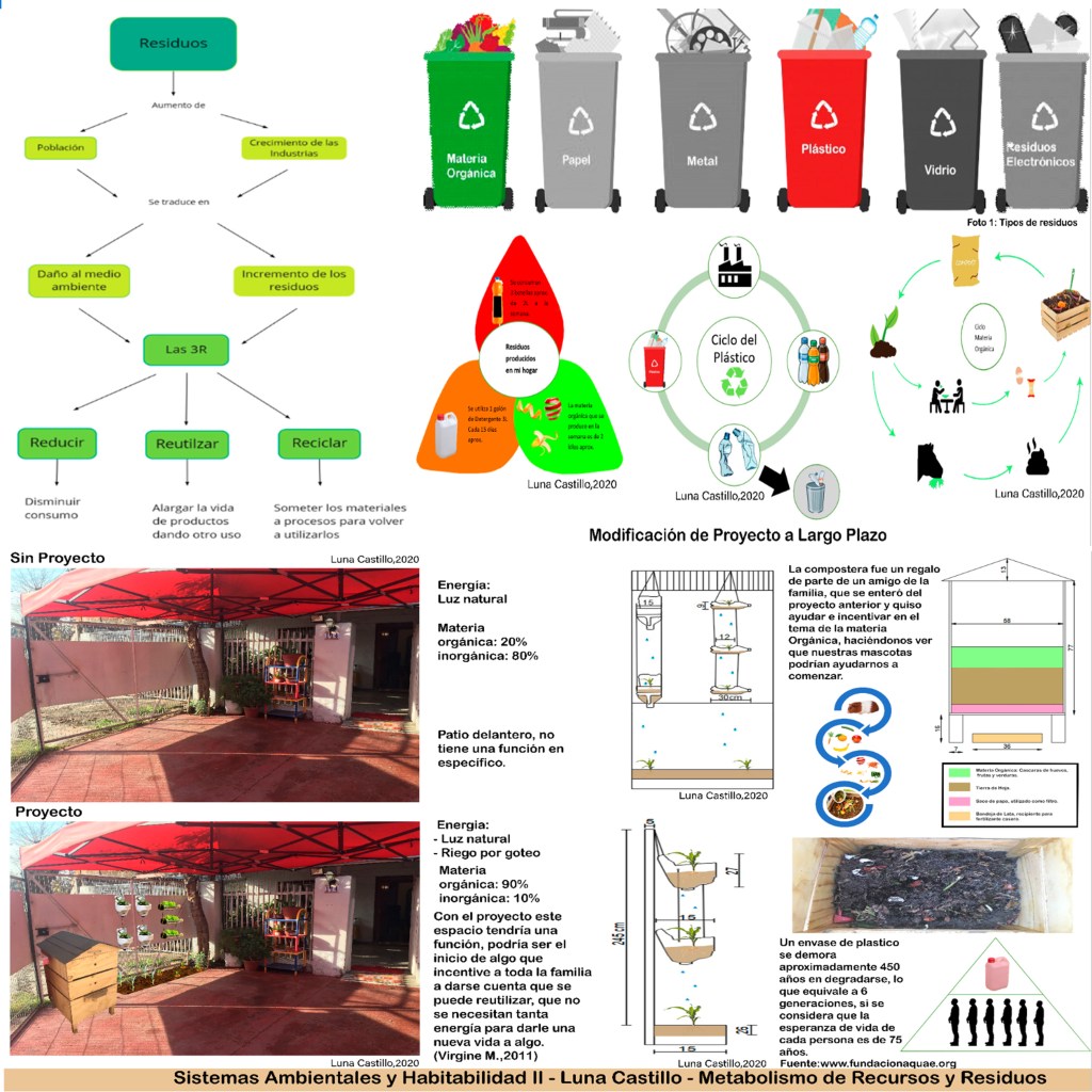 Para comenzar con esto, se preguntó si los materiales que se utilizarían anteriormente eran los correctos y se llegó a la conclusión de que se podría hacer algo más con esto, ir más a fondo y buscar algún material que realmente pudiera tener las características de las 3R, que necesitábamos ahora, por lo cual se llegó a la idea de realizar un pequeño catastro de los residuos, el cual ayudara a tener una noción más real e inmediata que cuales eran los verdaderos residuos que se producían en casa, el resultado fue que la mayoría de estos, se dividían entre el plástico (botellas y bidones de detergente) y la materia orgánica, razón por la cual se toma la decisión de trabajar con estos residuos y no con el anterior (pvc), lo que conlleva a una completa modificación del esquema en el proyecto.