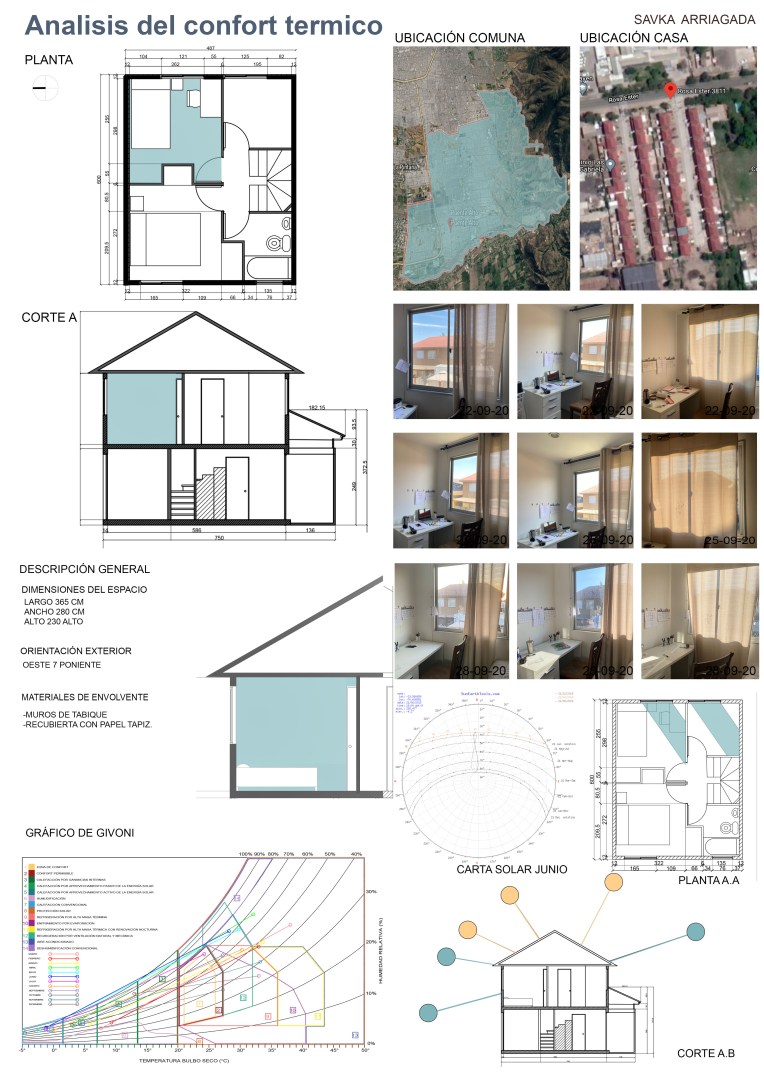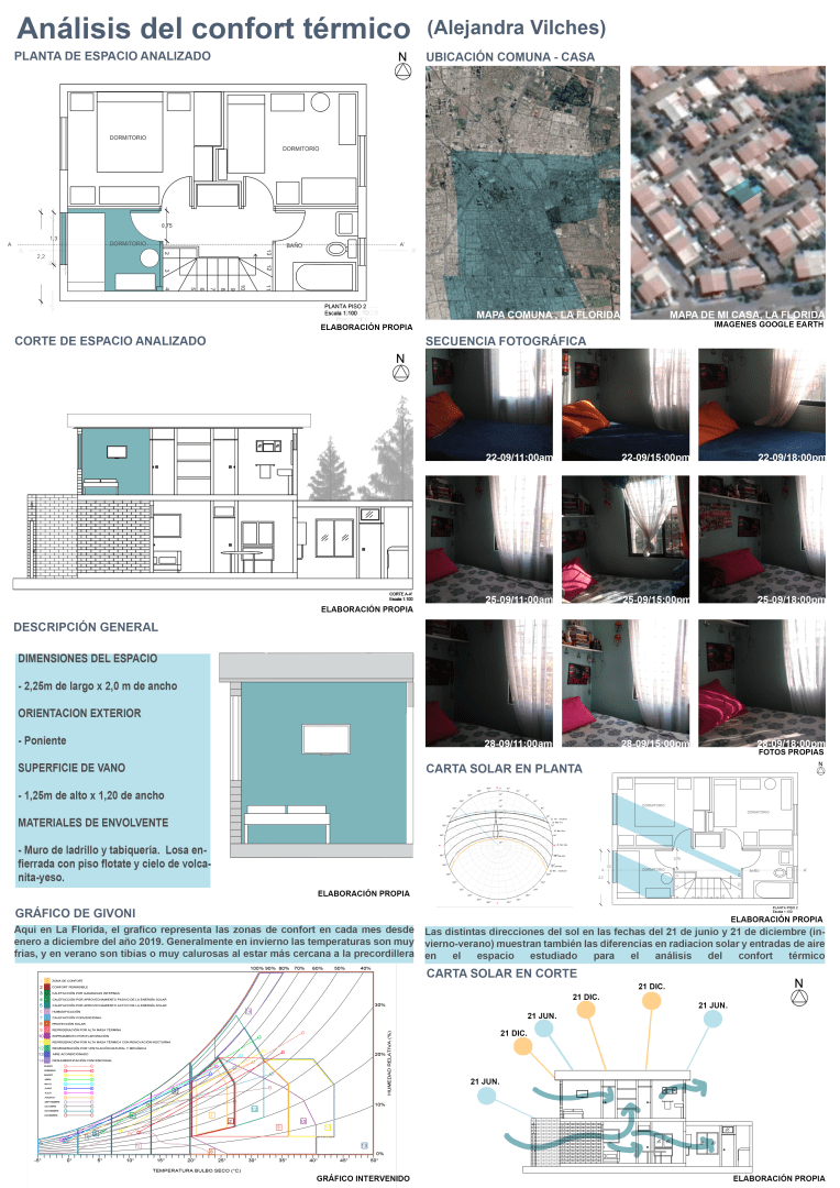 En este trabajo se realizo un análisis del confort térmico en 3 viviendas de distintas comunas, La Florida, Puente Alto y San Bernardo. Análisis que realizamos en un espacio de nuestra casa con al menos una entrada de luz, viendo la incidencia del sol en el lugar, las temperaturas que ahí se encuentran mostrando variación en el aire y la humedad. Todo el estudio realizado podemos verlo en los distintos cortes, plantas, fotos y el Grafico de Givoni que es fundamental para saber distintas características del espacio. Finalmente llegamos a las comparaciones y conclusiones de los 3 distintos casos analizados.