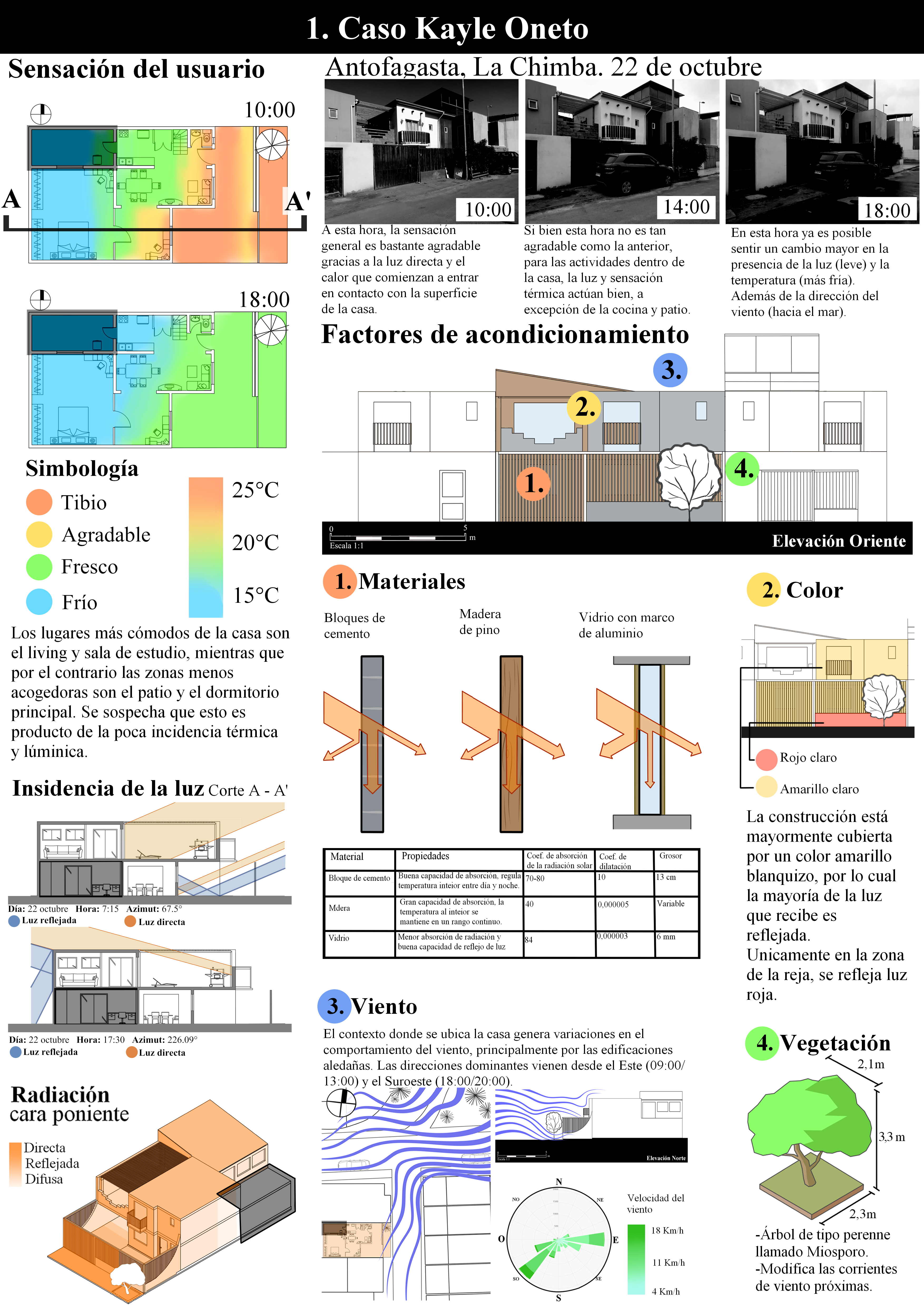 Para llevar a cabo el análisis se consideraron factores lumínicos, temperatura, viento y vegetación, donde cada uno fue relacionado con las demás variables (análisis del comportamiento térmico asociado a la radiación solar, estudio del viento, temperatura y radiación comparándose el recinto más afectado negativamente, entre otros) reconociendo el de la edificación. También se tomó en cuenta sensaciones e imágenes, estudios del viento analizando la dirección de esta y la velocidad del viento, estudios de la radiación, contamos con parámetros de radiación de absorción y de dilatación en los materiales pertenecientes a la casa.