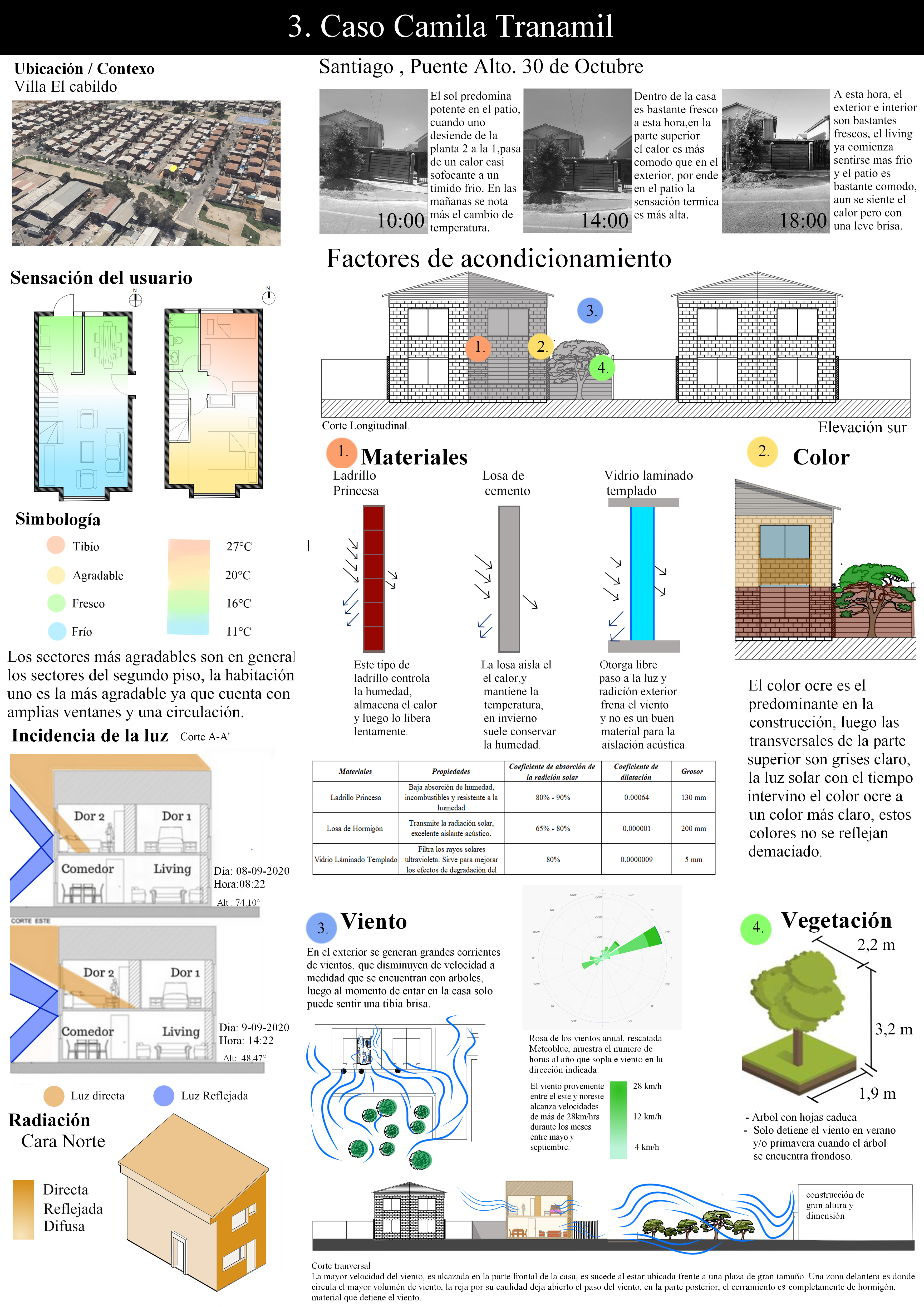 Gracias a los datos fue posible concluir que las condiciones del caso 2 y 3 son muy similares ya que la distancia que las separa es bastante próxima, presentan emplazamientos muy parecidos como el tener una pequeña plaza al frente de sus casas, pertenecer a una misma comuna, las dimensiones y altura y finamente las dos tienen contacto con la radicación solar que proveniente de una dirección semejante (norte).