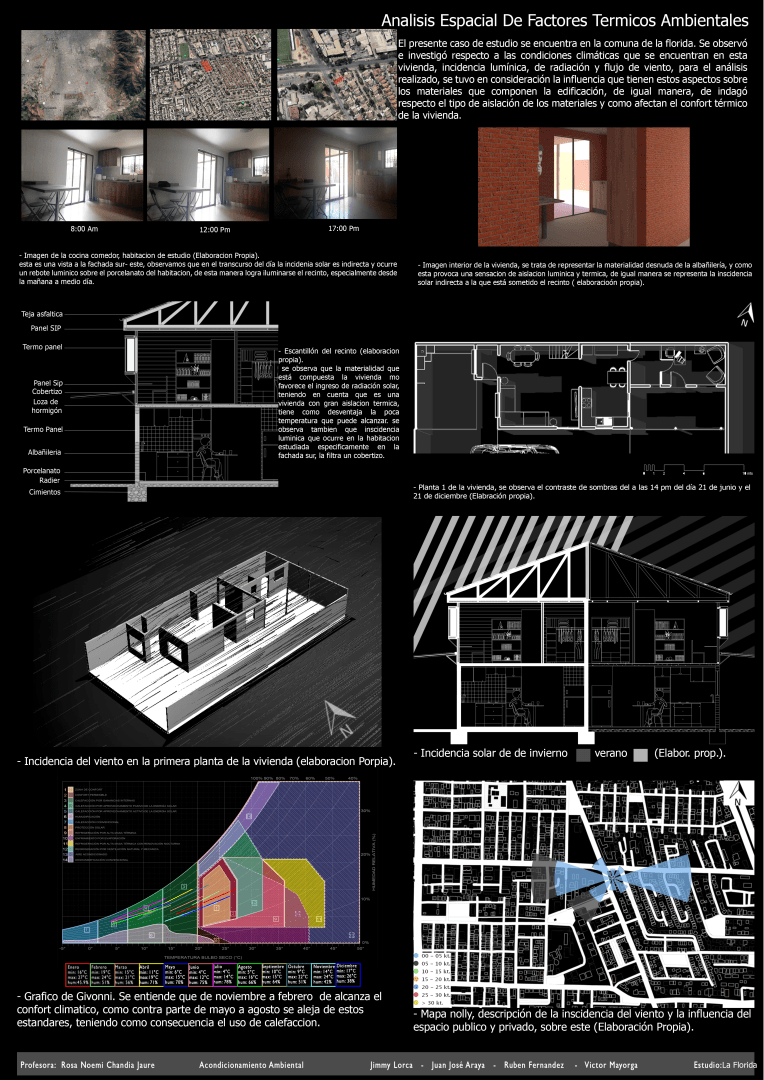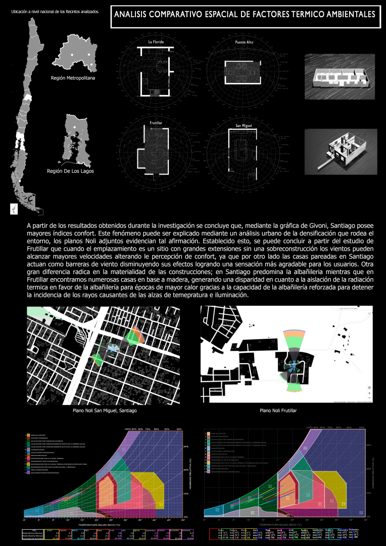 Anteriormente se presentó el estudio y desarrollo de la herramienta del diagrama de Givoni, ya en esta ocasión damos a conocer en lo que decantó el estudio, pues tenemos condiciones adversas en los lugares analizados, teniendo en cuenta que se estudia la ciudad de Santiago y una pequeña ciudad al sur (Frutillar). Al entender el diagrama las diferencias se hicieron aun mas palpables sumándole los otros componentes estudiados, viento, materiales, contexto, al observar notamos contrastes marcados, por ejemplo, áreas construidas en los sectores aledaños a las viviendas en las láminas se presentará un Plano Nolli que demuestra lo afirmado. Por otra parte, tenemos los materiales utilizados y como estos son afectados para bien o para mal con las condiciones climáticas, en este punto por ejemplo vemos que en frutillar hay fachadas que con el tiempo y producto que no están construidas con buen material se pudren con mucha facilidad producto de la dirección del viento predominante, humedad y lluvia, aunque de los más ventajoso es que también en otras zonas la vivienda consta aun con madera nativa con la que fue construida, por ende se puede asegurar que la resistencia de ésta es mayor mas si hablamos de madera que se utilizó en la estructura. Versus Santiago en donde la materialidad casi consta de puro hormigón armado, que, si bien habla de una resistencia estructural, también se puede ver desde el punto de vista de la absorción y liberación de radiación.