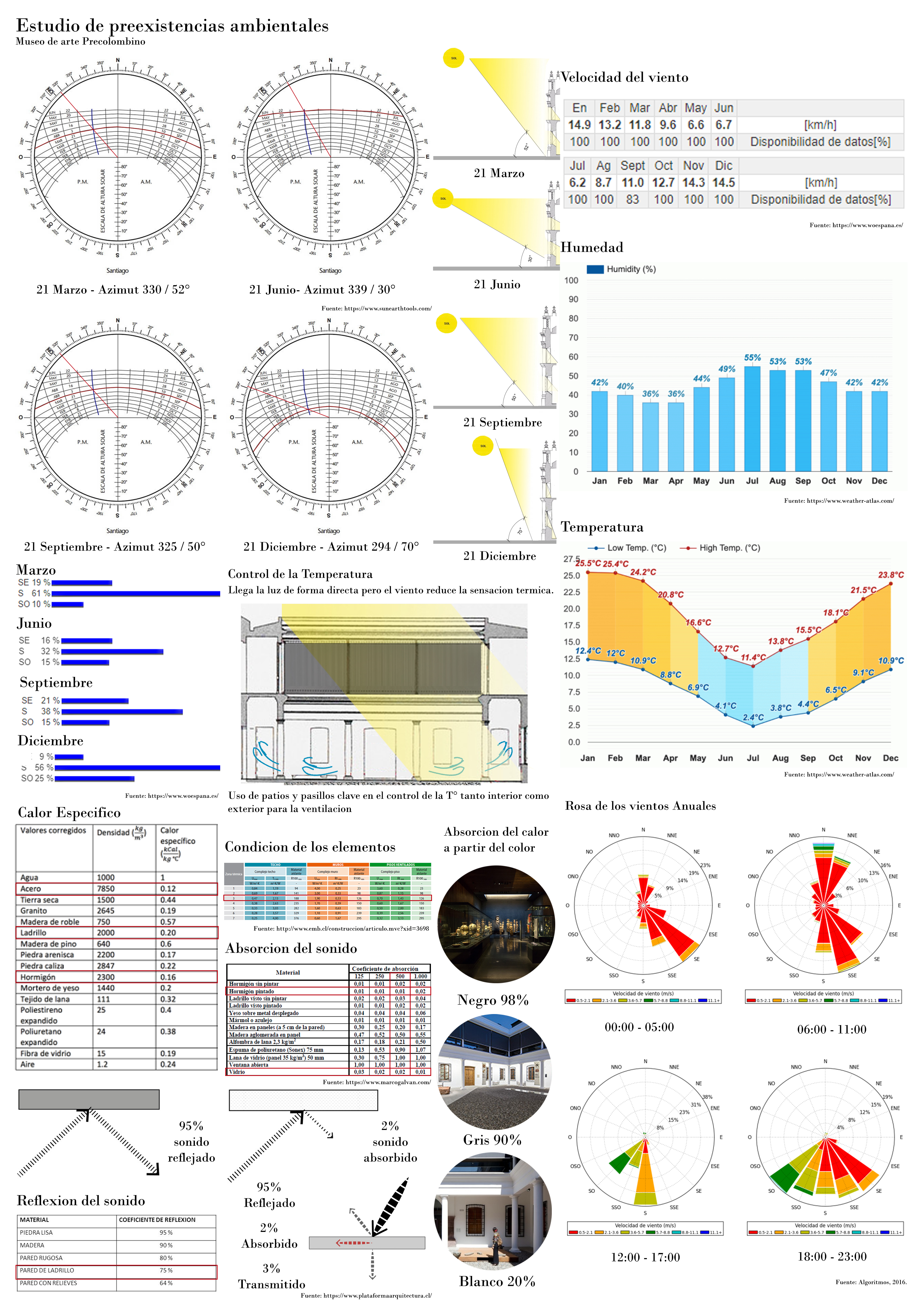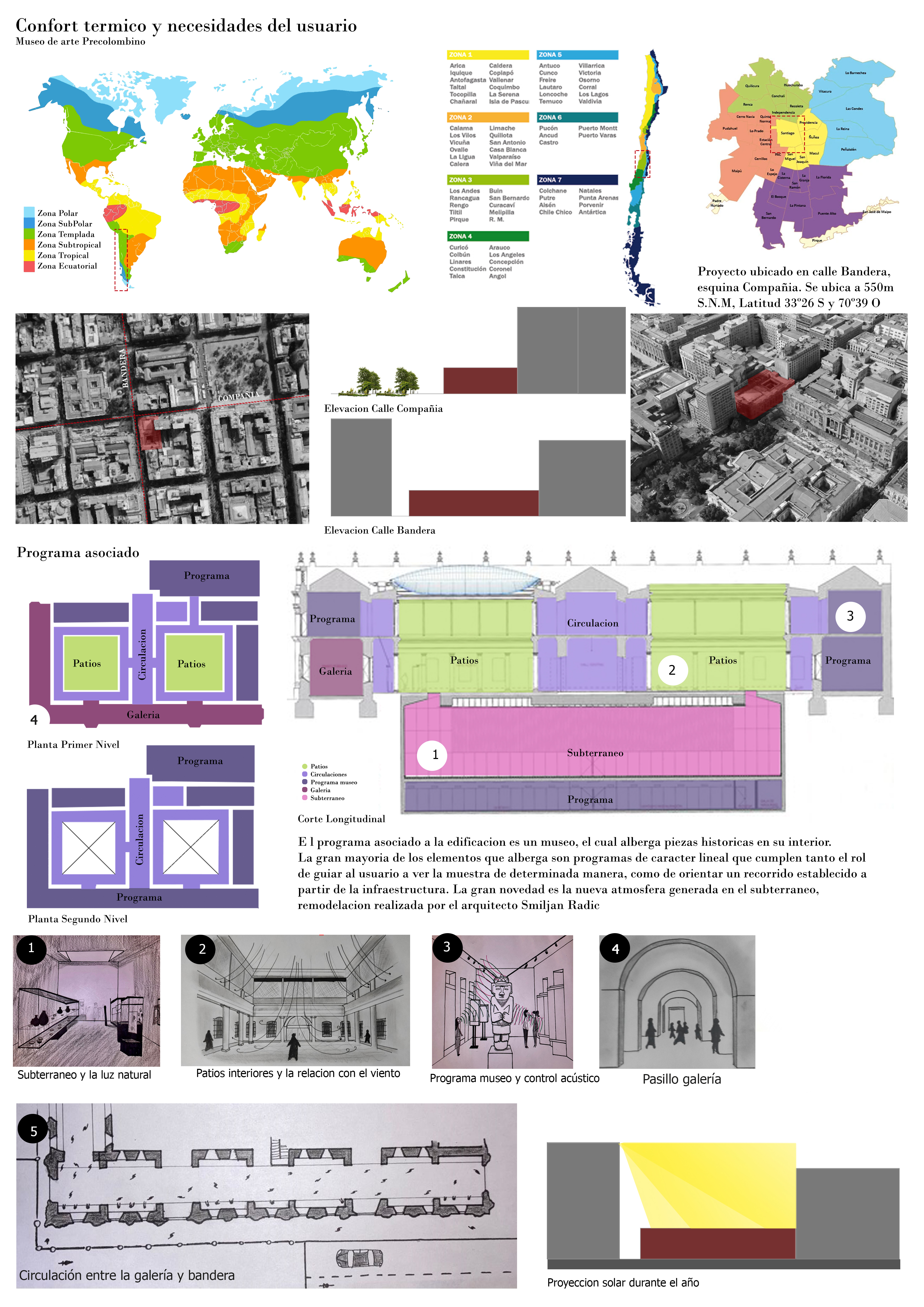El programa del museo posee un sistema de acondicionamiento activo para generar un control tanto del ruido como la temperatura, lo cual se provoca la separación a lo que ocurre en el exterior, donde los programas mas asociados a la circulación y acceso a los pasillos y patios, funciona mediante el uso de sistemas pasivos, comprendiendo el movimiento de la ventilación, del sol y las sombras que se generan en el lugar.