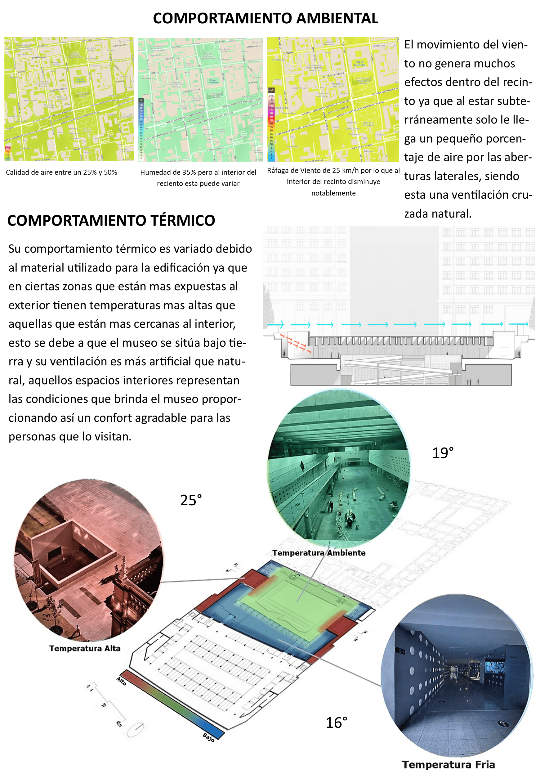 Esta edificación se ubica bajo tierra por lo cual su temperatura interior es amigable , es decir el aire que ingresa al interior es mínimo y mantiene una sensación de frescor, a esto se suma que la luz ingresa de manera indirecta y rebota gracias a la materialidad, por lo cual es un ambiente iluminado gracias a la luz natural.