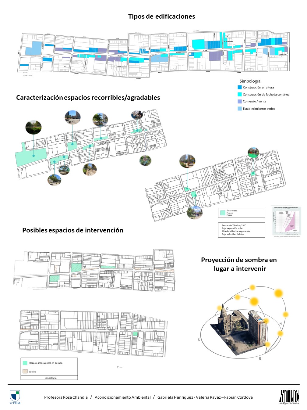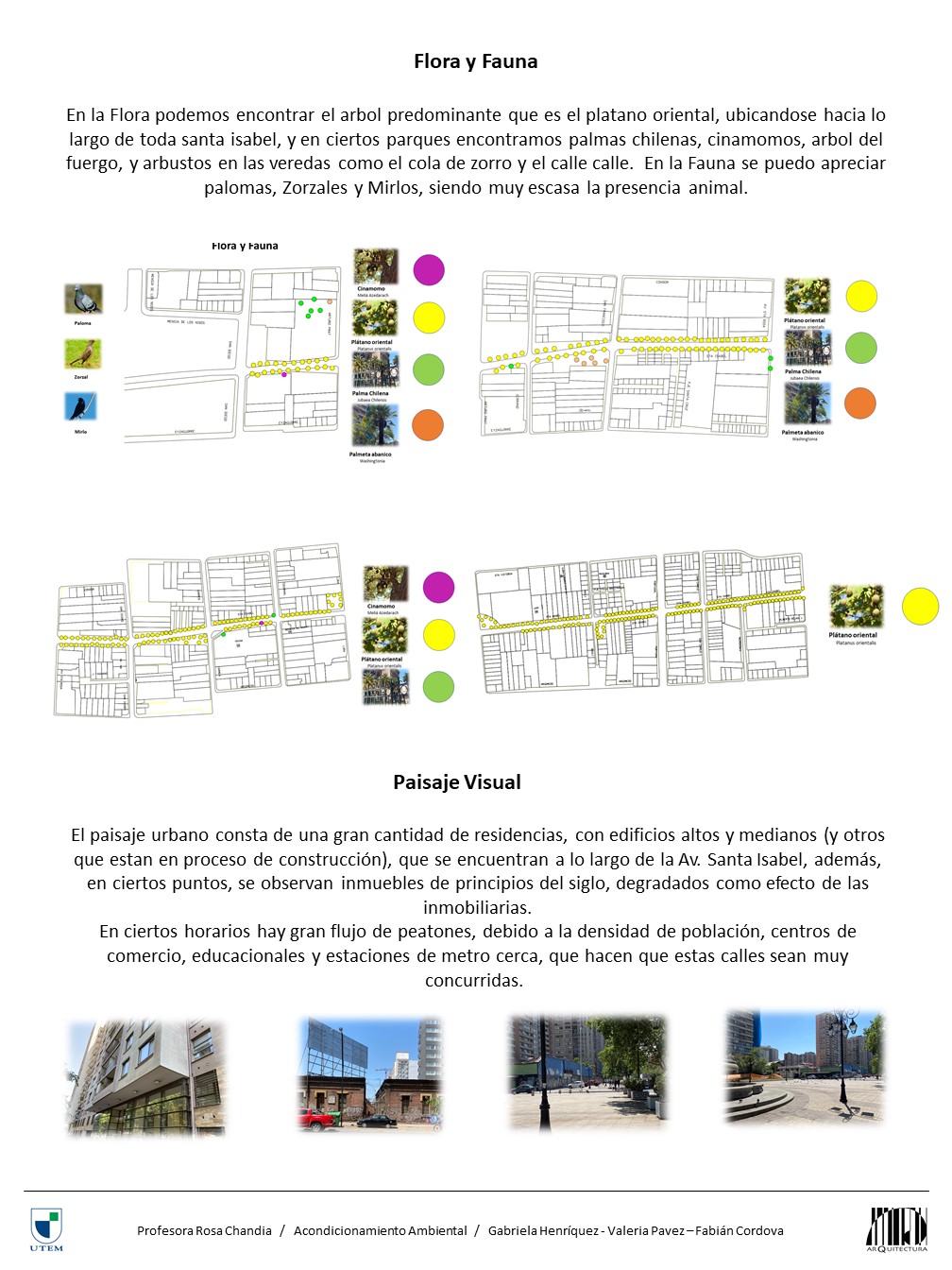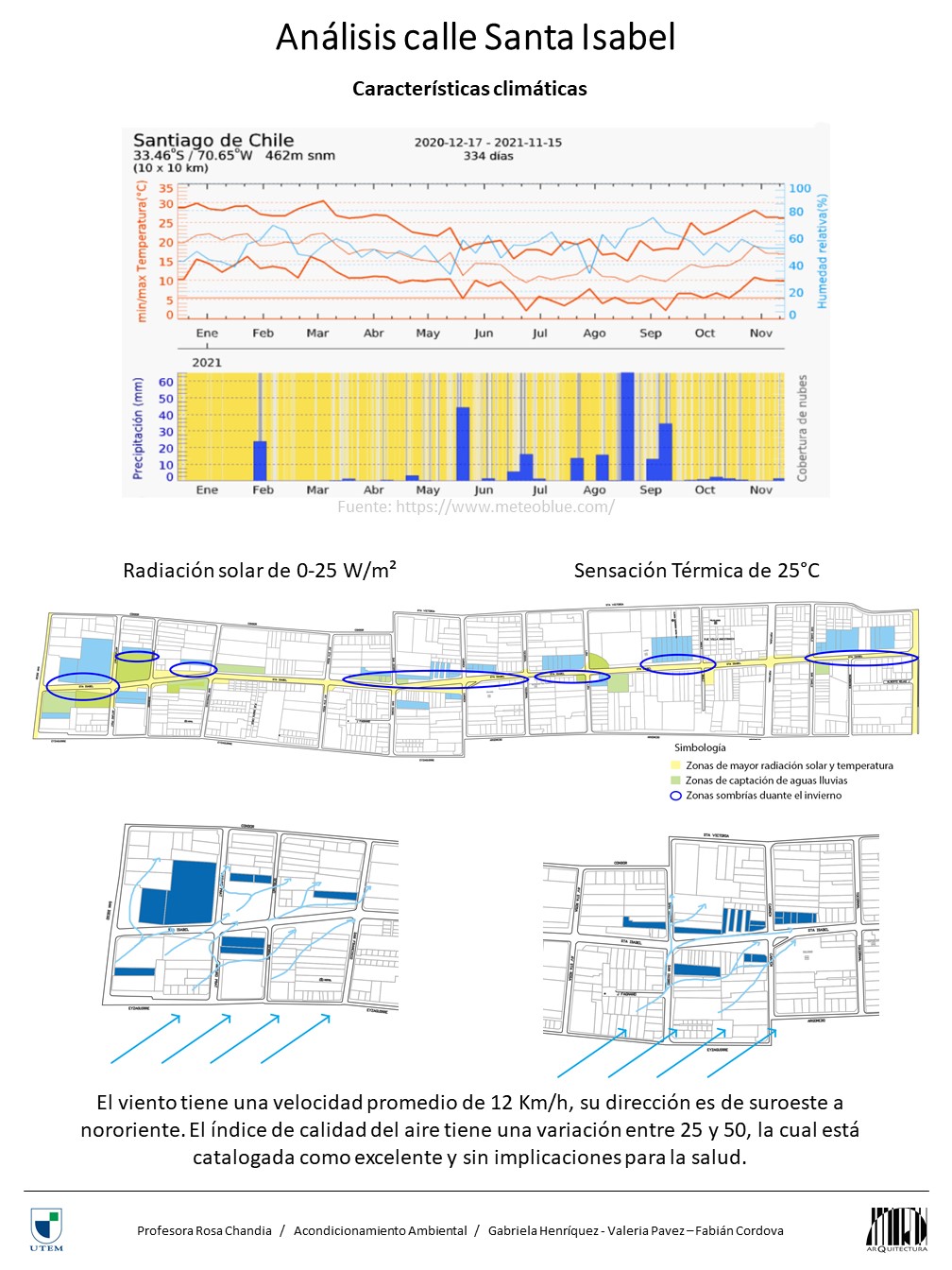 El análisis realizado está enfocado principalmente en las condiciones medioambientales y climáticas del entorno, y en las relaciones de las personas con los diferentes espacios a lo largo del trayecto. Se analizaron elementos tales como la permanencia de las personas en ciertos lugares destinados a esto, el confort ambiental que estos otorgan, la eficiencia de los espacios recreativos, la permeabilidad de los suelos, la radiación solar en diferentes puntos, la flora y fauna presente en a lo largo de la calle, entre otros.