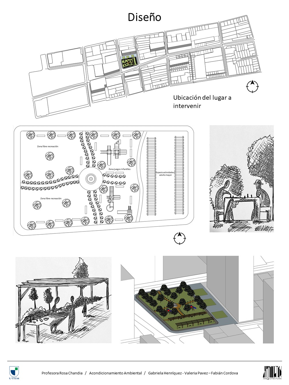Considerando los análisis y el diagnostico generado, se plantea una espacio e idea para realizar un proyecto de intervención. El lugar definido se sitúa en la plaza frente a la iglesia, la intervención consiste en crear y proporcionar un espacio para diversas actividades como ferias, exposiciones, etc., a través de estructuras que cumplen la función de techumbre, similar a una pérgola, con el objetivo de generar sombra y, por tanto, un lugar más agradable para su permanencia. A su vez se dispone de un espacio con mesas de ajedrez para invitar a los usuarios a participar de este espacio. Por otro lado, la intervención incluye un área de juegos para los niños y familias que viven en el sector. Todo lo anterior va complementado con proporcionar más áreas verdes con la incorporación de pasto y especies nativas ya presentes en el recorrido, con el objetivo de mejorar las condiciones ambientales, proporcionando mayores áreas de sombra, promoviendo el uso y permanencia en estas y, mejorando la humedad y sensación térmica, ayudando al confort ambiental tanto de la plaza como del sector.