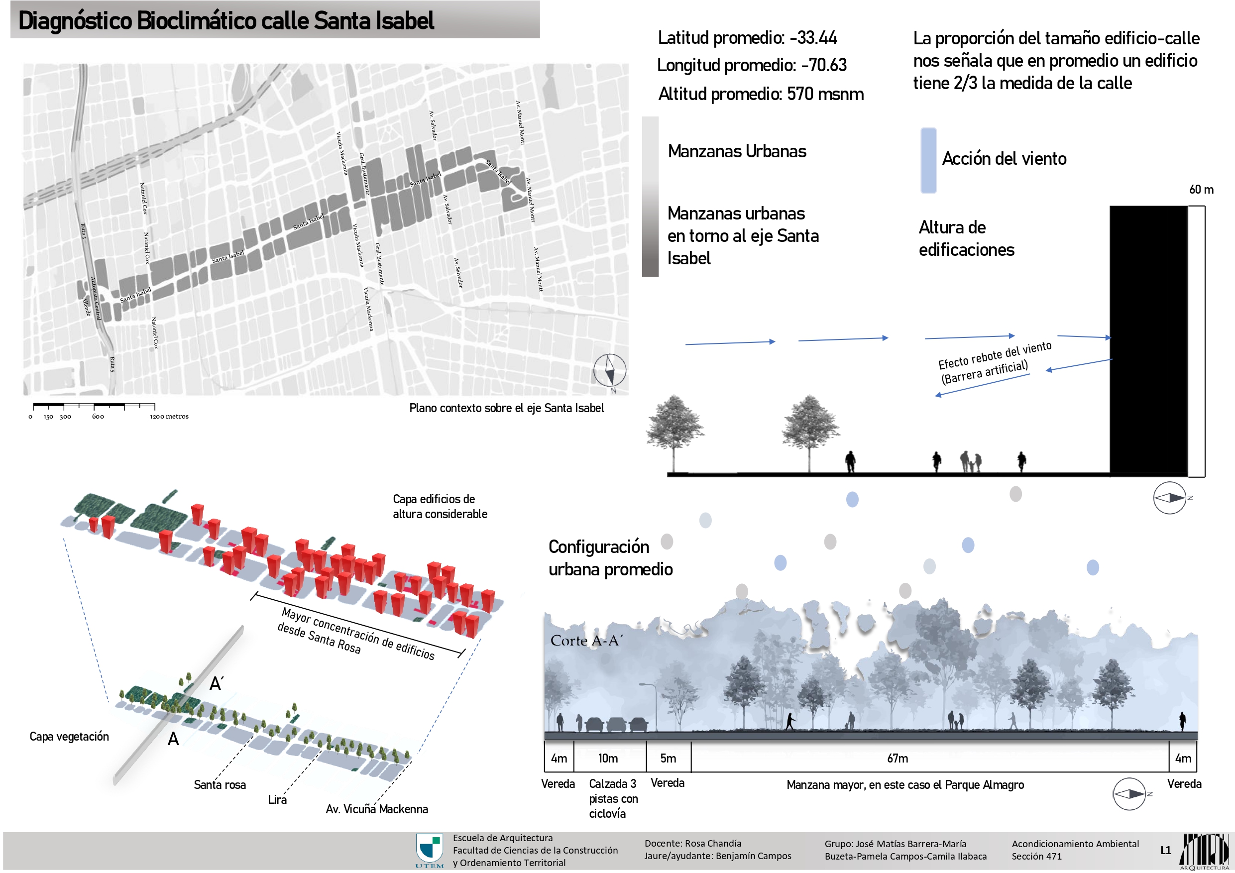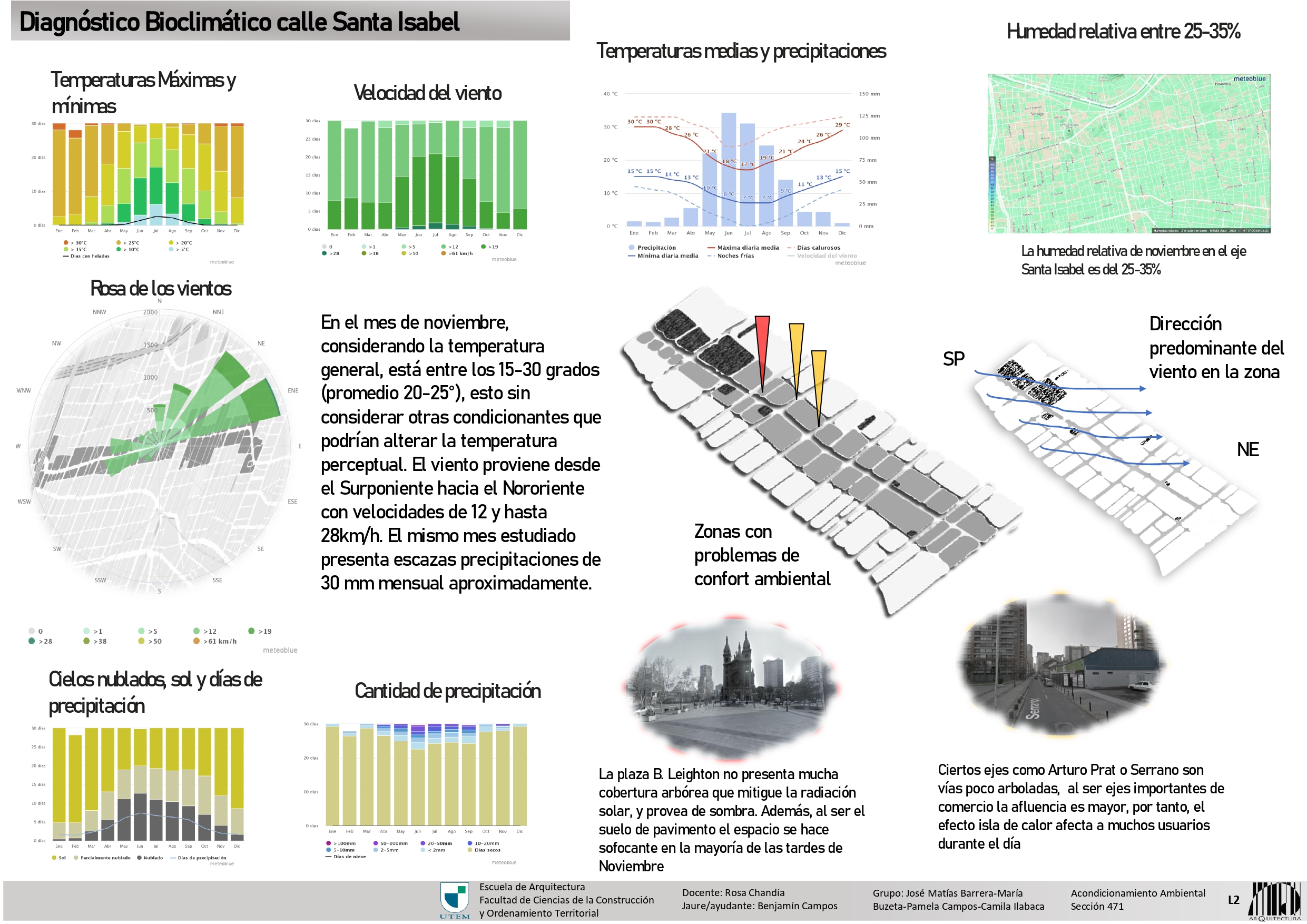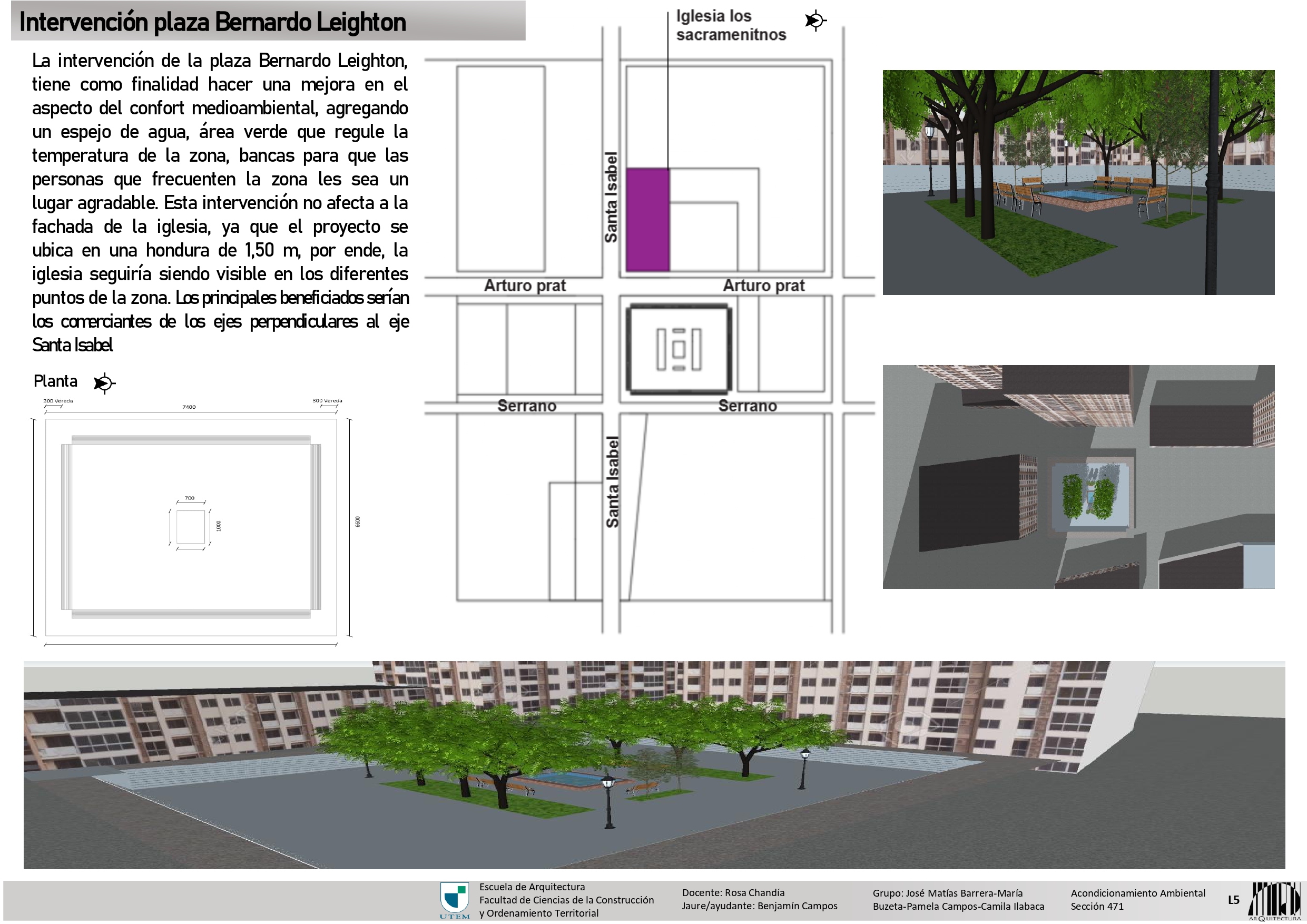 Luego de realizar un recorrido en el eje Santa Isabel ubicado en pleno centro de Santiago, estudiando sus características urbanísticas y preexistencias ambientales, realizamos la investigación correspondiente sobre este lugar analizándolo en profundidad y con los conocimientos adquiridos en el curso Acondicionamiento Ambiental. Primeramente, nuestra investigación comprendió toda la zona en torno al eje Santa Isabel donde estudiamos las diferentes problemáticas y cómo estas afectaban al entorno en diferentes épocas del año, toda esta información sería la base en donde sentar nuestro diagnóstico bioclimático mediante la metodología realizada por Ester Higueras en su libro «Urbanismo Bioclimático». Apoyándonos en todo esto logramos graficar las distintas variables ambientales que se presentaban en la zona estudiada, cómo por ejemplo lo son la radiación solar, humedad relativa, calidad del aire, temperaturas, estudios sobre el viento, entre otros, así poder abarcar y comprender todos los criterios necesarios para una consecuente estrategia de acondicionamiento pasiva como solución a determinados problemas que la zona estudiada pudiese presentar. Luego de este diagnóstico bioclimático urbano logramos descifrar las claves y obtener conclusiones necesarias para la siguiente etapa como lo es la etapa de diseño. En la intervención propuesta nos esforzamos en considerar las distintas variables estudiadas, así como el buen diseño de un espacio que proporcionara tanto las condiciones ambientales óptimas para sus usuarios como que fuese un aporte urbanístico en cuanto a la estética de la ciudad, sin llegar a desvalorar la importancia de la fachada de la iglesia los sacramentinos. Con esto nace la idea de proponer un nuevo rediseño en la plaza Bernardo Leighton, cual sufre las consecuencias de ser una plaza que no cumple bien su función debido a su mal diseño, para transformarla en un espacio con paisajismo urbano que cuente tanto con un espejo de agua como con vegetación en hiladas, esto para beneficiar la zona misma de intervención como los ejes que reciben el viento más fresco hacia el noreste, las cuales son zonas de mucho comercio y por tanto con gran afluencia de personas.