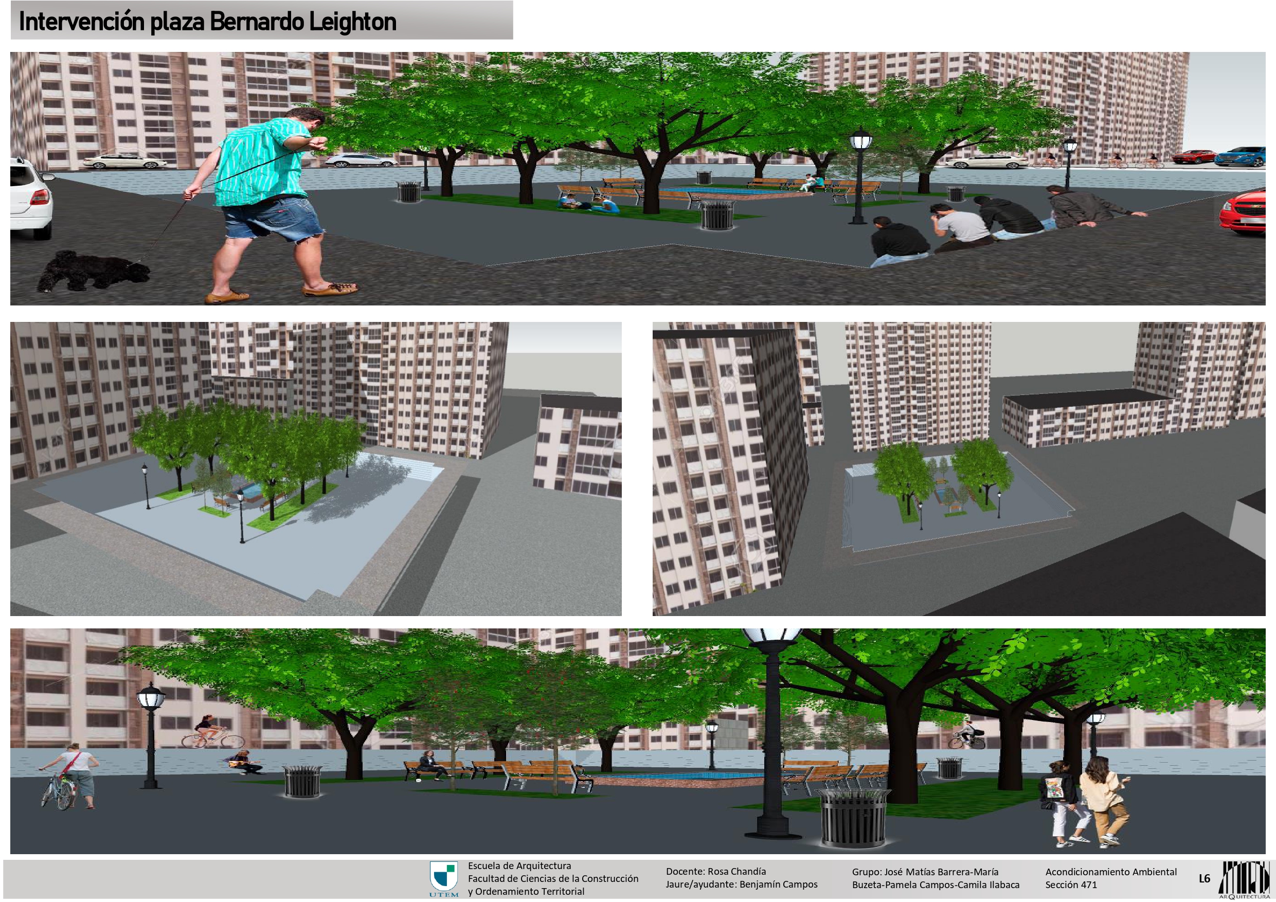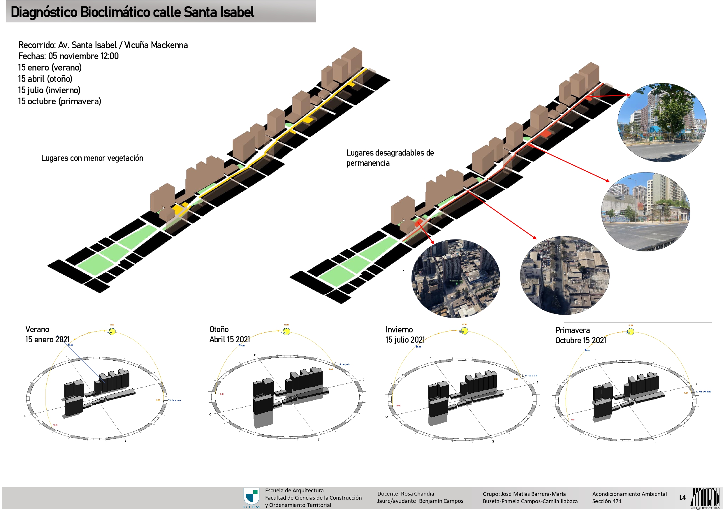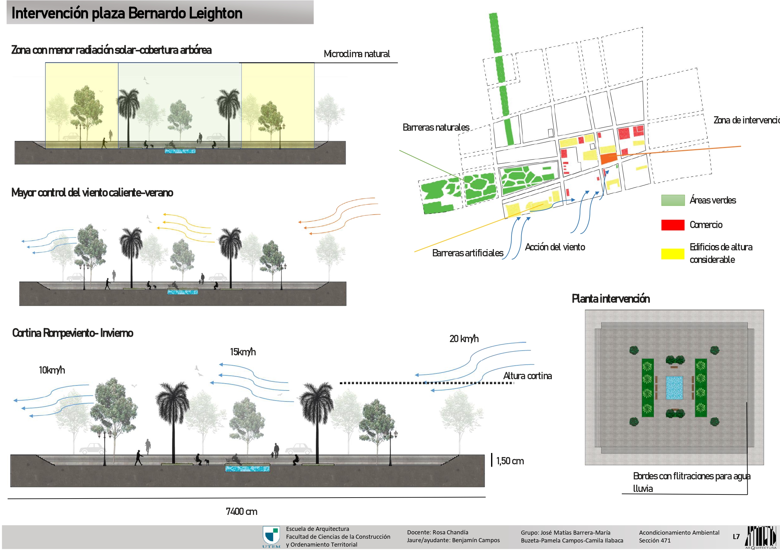Luego de realizar un recorrido en el eje Santa Isabel ubicado en pleno centro de Santiago, estudiando sus características urbanísticas y preexistencias ambientales, realizamos la investigación correspondiente sobre este lugar analizándolo en profundidad y con los conocimientos adquiridos en el curso Acondicionamiento Ambiental. Primeramente, nuestra investigación comprendió toda la zona en torno al eje Santa Isabel donde estudiamos las diferentes problemáticas y cómo estas afectaban al entorno en diferentes épocas del año, toda esta información sería la base en donde sentar nuestro diagnóstico bioclimático mediante la metodología realizada por Ester Higueras en su libro «Urbanismo Bioclimático». Apoyándonos en todo esto logramos graficar las distintas variables ambientales que se presentaban en la zona estudiada, cómo por ejemplo lo son la radiación solar, humedad relativa, calidad del aire, temperaturas, estudios sobre el viento, entre otros, así poder abarcar y comprender todos los criterios necesarios para una consecuente estrategia de acondicionamiento pasiva como solución a determinados problemas que la zona estudiada pudiese presentar. Luego de este diagnóstico bioclimático urbano logramos descifrar las claves y obtener conclusiones necesarias para la siguiente etapa como lo es la etapa de diseño. En la intervención propuesta nos esforzamos en considerar las distintas variables estudiadas, así como el buen diseño de un espacio que proporcionara tanto las condiciones ambientales óptimas para sus usuarios como que fuese un aporte urbanístico en cuanto a la estética de la ciudad, sin llegar a desvalorar la importancia de la fachada de la iglesia los sacramentinos. Con esto nace la idea de proponer un nuevo rediseño en la plaza Bernardo Leighton, cual sufre las consecuencias de ser una plaza que no cumple bien su función debido a su mal diseño, para transformarla en un espacio con paisajismo urbano que cuente tanto con un espejo de agua como con vegetación en hiladas, esto para beneficiar la zona misma de intervención como los ejes que reciben el viento más fresco hacia el noreste, las cuales son zonas de mucho comercio y por tanto con gran afluencia de personas.
