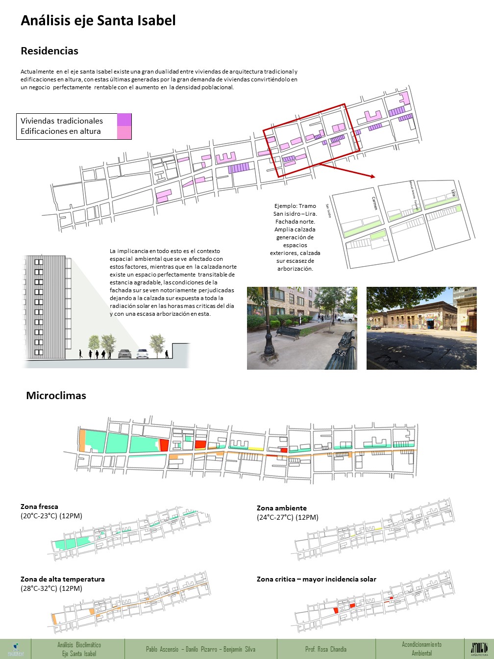Dicho esto, y previamente analizando diversos puntos del eje Santa Isabel, damos cuenta que existe una variada existencia de micro climas, algunos más favorables y confortables que otros, esto dado a la existencia de plazas, algunas mejor equipadas con árboles, vegetación y mobiliario público que contribuyen a formar un espacio común de descanso y permanencia, así igual las plazas que se forman gracias al retranqueo de los edificios principalmente los más modernos, su presencia está fuertemente marcada al norte de la calle Santa Isabel del cual el espacio que se forma está prácticamente sombreado casi todo el día. Hay más flujo de viento principalmente en las esquinas donde se emplazan estos edificios, lo que lo hacen muy confortable. A diferencia de la vereda sur, esta mucho menos equipada con plazas o arbolado que brinden sombra o espacios de permanencia, está mucho más expuesta a la radiación solar directa y los edificios del frente no alcanzan a dar sombra prácticamente en todos los mediodías de verano incrementando su temperatura y en invierno la sombra es abundante, el espacio el frio y sin luz natural directa.