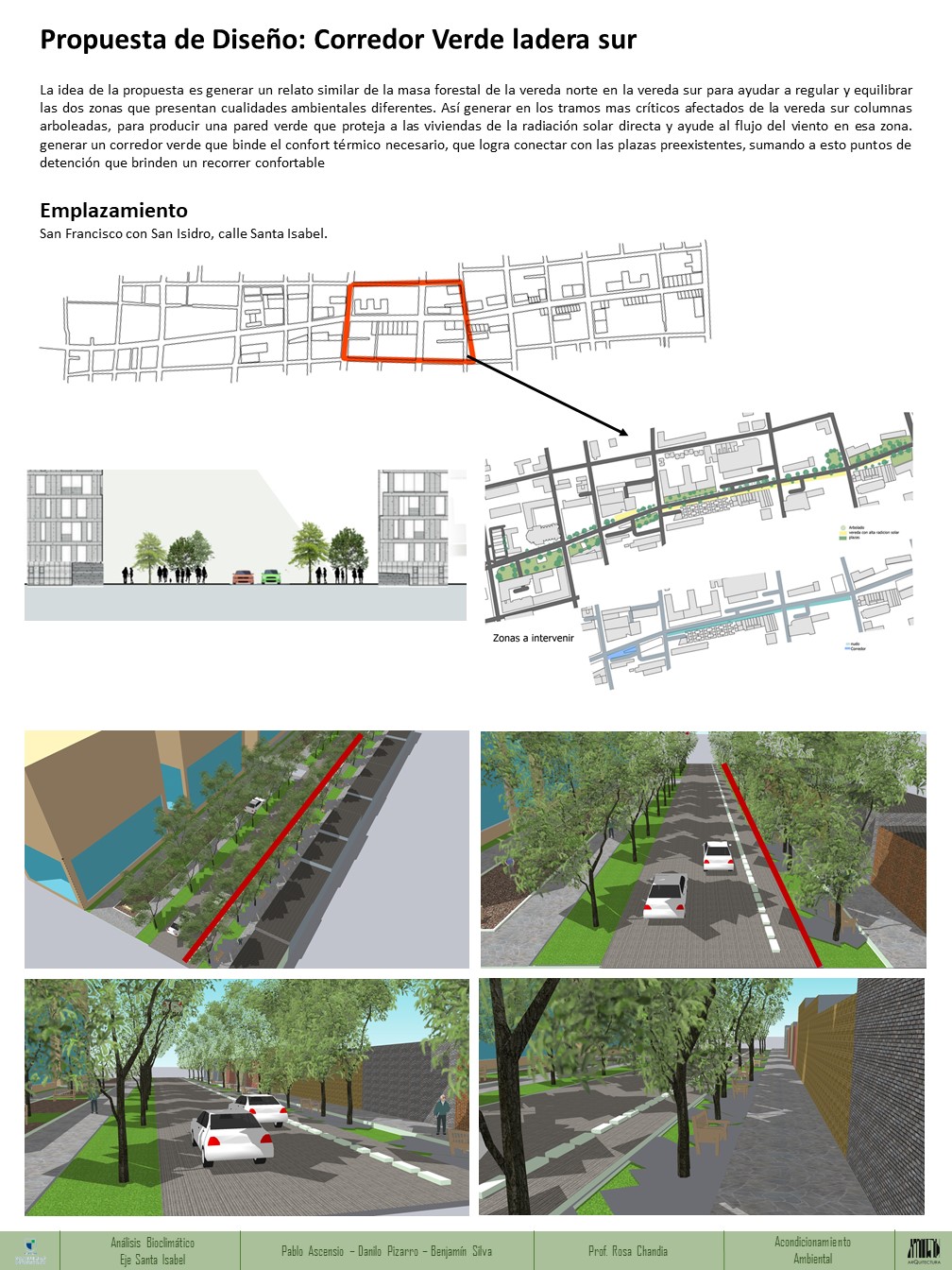 Hablando de estas problemáticas detectamos que en la vereda sur es la más afectada, está equipada con casas tradicionales de baja altura como los sites con algunos espacios comerciales y con una vereda diminuta y desprotegida del sol. Dicho esto, proponemos intervenir una gran parte de esta vereda principalmente entre la calle San Francisco y San Isidro en donde en sus extremos se encuentran plazas que son el resultado del retranqueo de algunos edificios. Siguiendo la lógica de un sistema de infraestructura verde, nuestro proyecto funciona como un corredor de biodiversidad al brindar con sombra gran parte de este eje. Tratando de conectar estas plazas que funcionan como nodos la distancia es muy grande por lo cual se mobiliario público para darle sentido de permanencia a en algunos puntos de la vereda sur de la calle Santa Isabel.