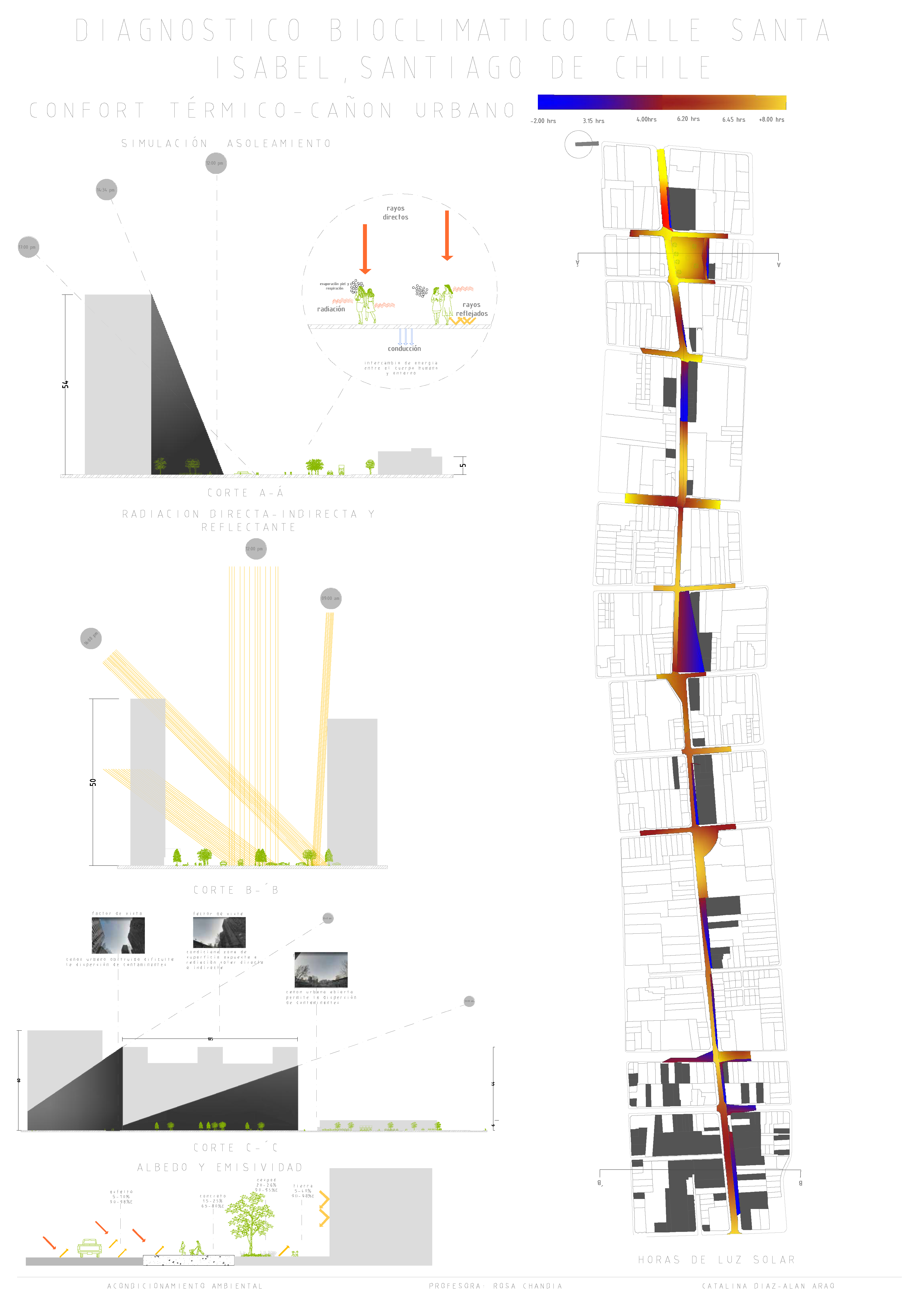 Finalmente a partir de la percepción y recolección de datos cuantitativos, se logra concluir que las fuentes que permiten la mitigación de la radiación solar , la emisividad del calor,la reducción del ruido ,es deficiente o carece de equipamiento adecuado para mejorar el contexto microambiental,el cual se ve potenciado por el cañón urbano denso.Dicho esto se propone a partir del concepto acupuntura urbana y bioclimática ,la creación de una zona verde en la linea sur-esquina lira con avenida santa isabel.Este es un punto de terreno ya modificado pero el equipamiento en vegetación es insuficiente y favorece al albedo y emisividad del sol en las edificaciones de bajo perfil.