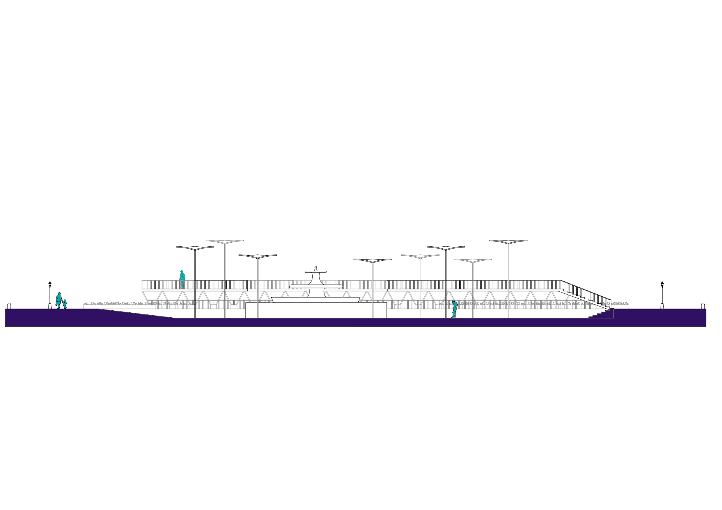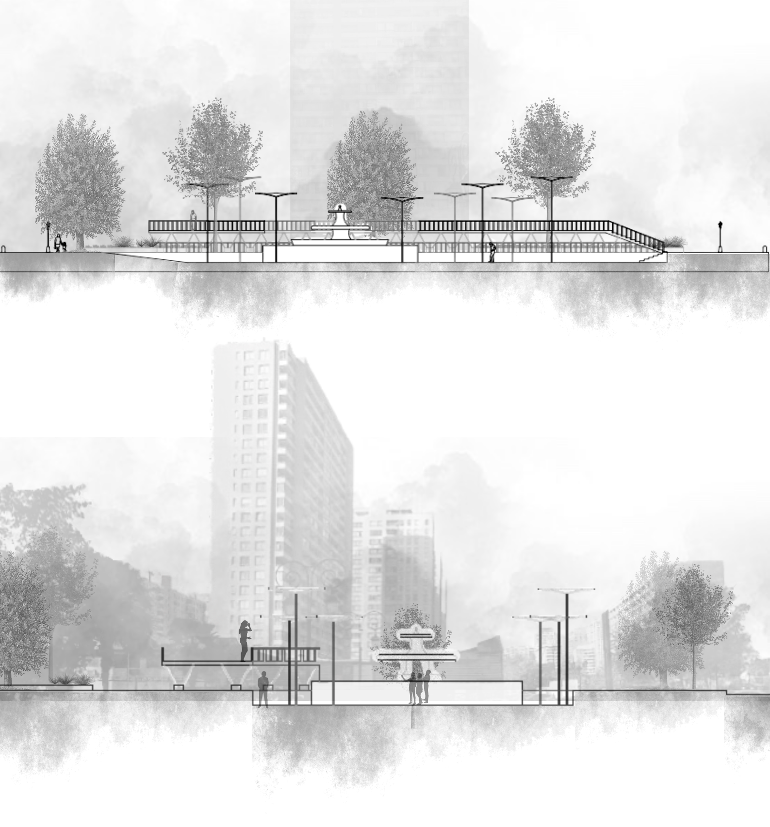 Es por esto, que hemos decidido proponer un espacio con condiciones óptimas y agradables para un correcto habitar, generando variables de habitabilidad en este espacio público pensando en el disfrute del usuario tanto local como de la población flotante. Para esto decidimos involucrar e incorporar vegetación, ya que los paisajes naturales representan dentro del ecosistema urbano espacios de naturaleza que contribuyen al equilibrio del sistema de ambiental local, también se propone la instalación de mobiliario urbano adaptado al contexto generando el máximo aprovechamiento de las condiciones preexistentes, proporcionando una conexión y sentido entre ambas. Sin embargo, el eje de la intervención será la remodelación del espacio seleccionado con la instalación de un puente complementado con un sistema de diferencia de alturas en el piso, siendo este el motor y generador de múltiples espacios y percepciones de confort para el usuario. En la planeación se tuvieron en cuenta condiciones ambientales, como el viento, la sombra y la incidencia del sol en los microclimas que presenta el lugar, sumándosele a esto, cubiertas funcionales de forma cóncava para la reutilización del agua lluvia, conocidas como bóvedas de Cascara, del Arquitecto Amancio Williams.